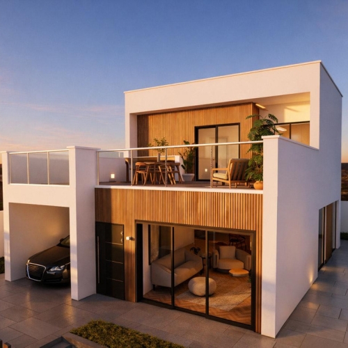 The development is equipped with pre-installed ducted air conditioning, electric blinds, and an 8 kWp photovoltaic system with a 6 kWp inverter.