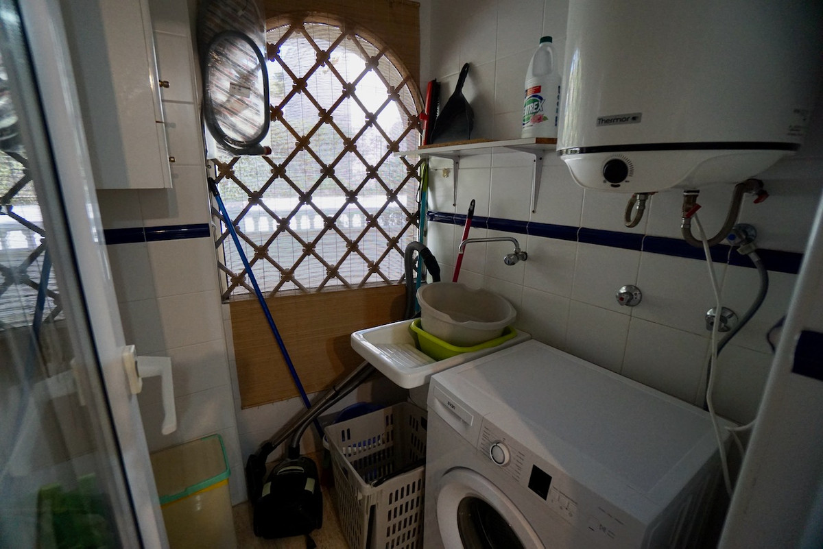The upper level features an inviting entrance hall with guest toilet, a bright lounge and dining area with stunning sea views, and access to a large sunny terrace overlooking the pool and beach. The separate kitchen is fully equipped and adjoins a convenient laundry room.