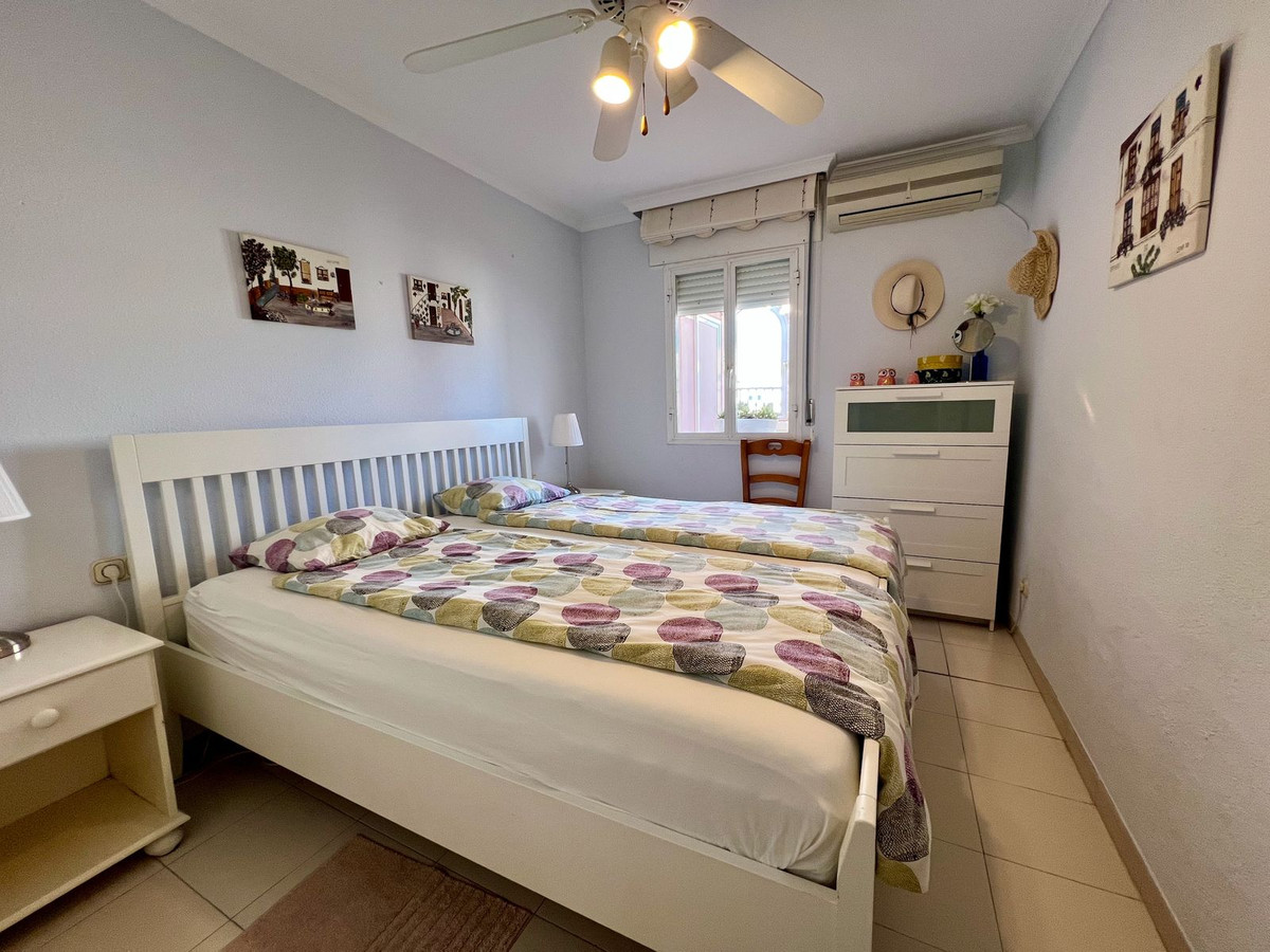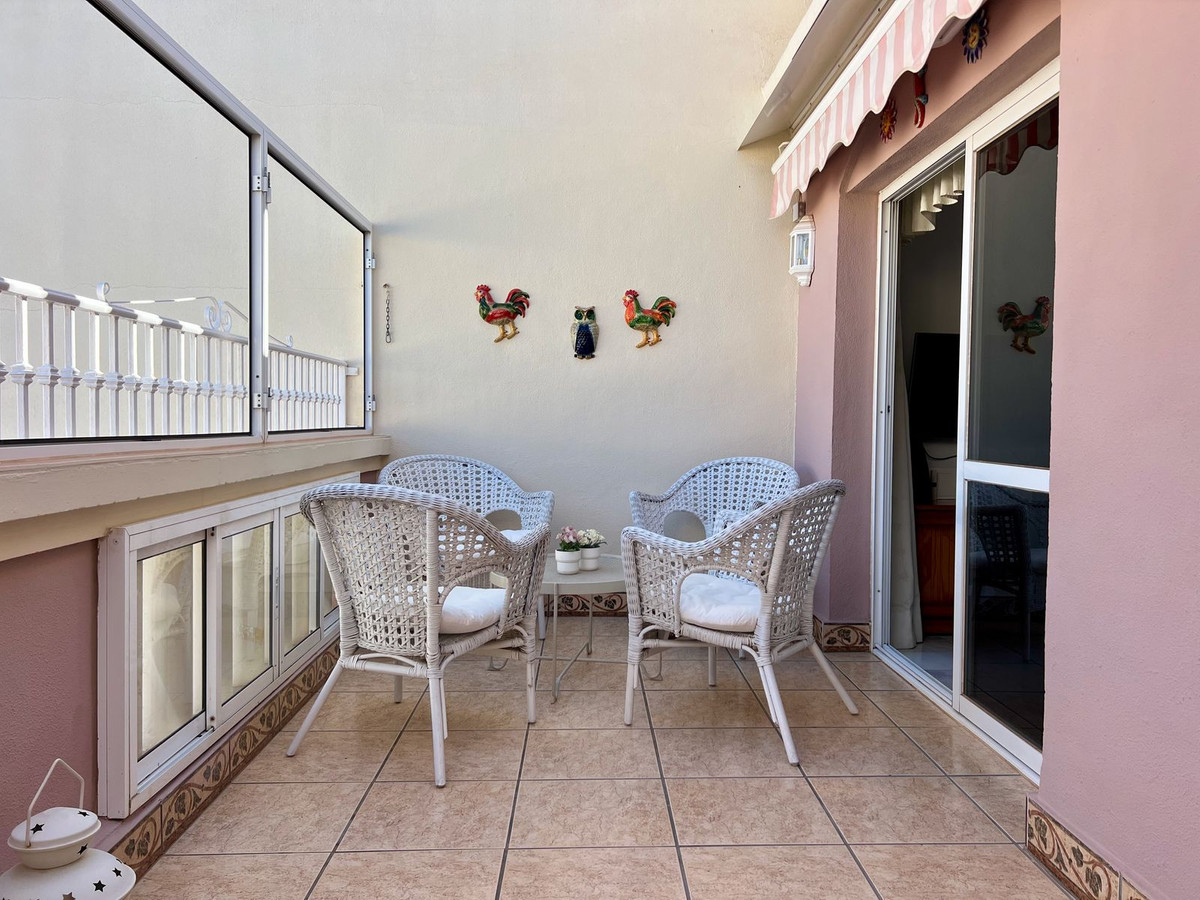 The layout includes a comfortable living and dining area, a compact kitchen, one bathroom, and a main bedroom. A section of the terrace has been enclosed and is currently used as a practical guest room, providing extra sleeping space or an ideal spot to work from home.