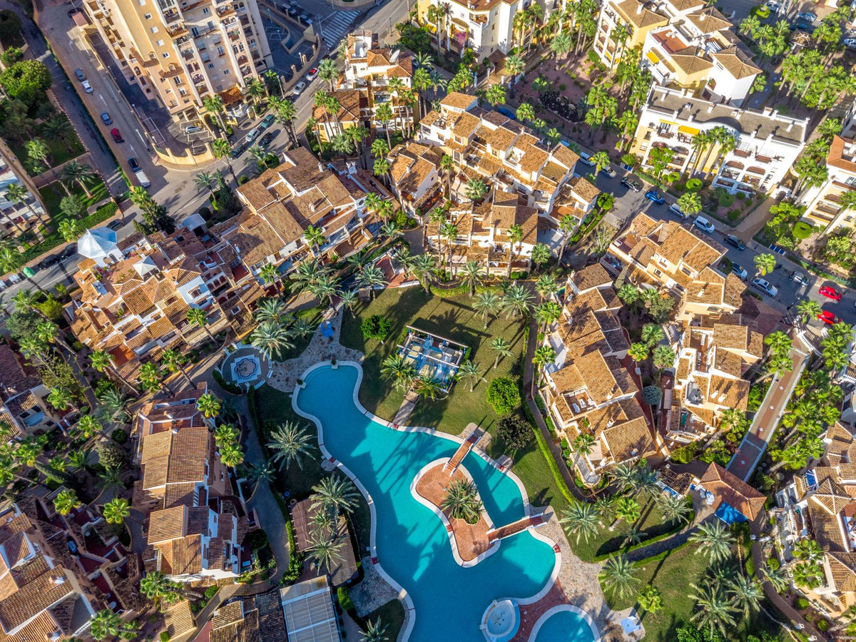 The area is built in a charming Mediterranean style with whitewashed facades, colourful details and small paths that wind through green communal areas with palm trees and flowers. Many of the homes have large terraces and balconies with views of the garden, pool or the sea.