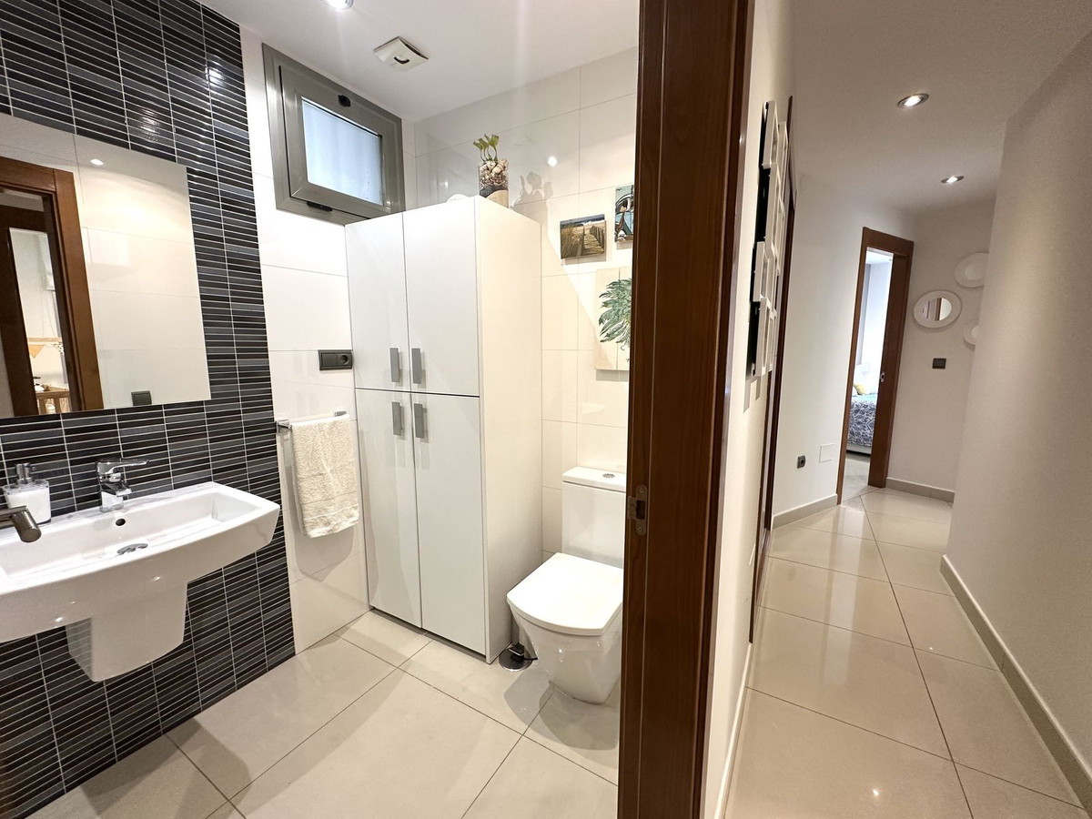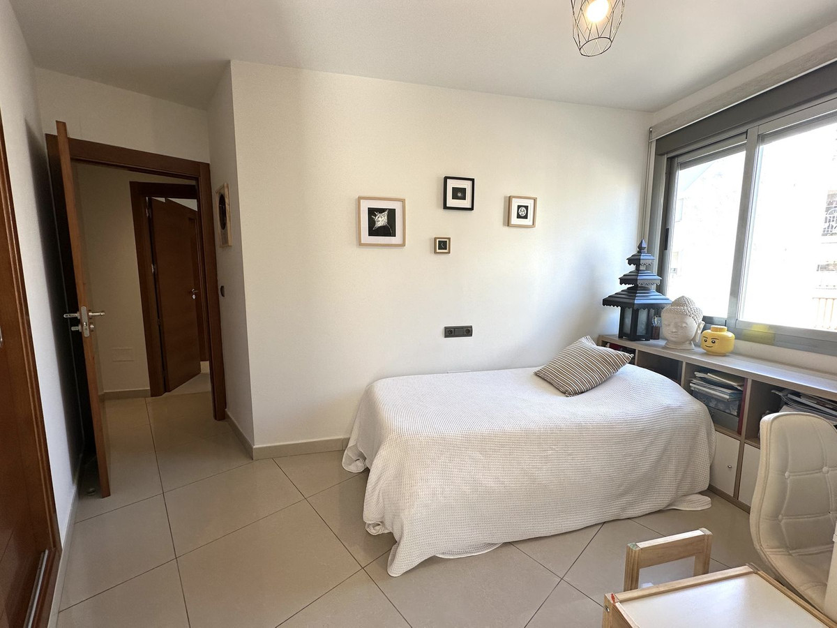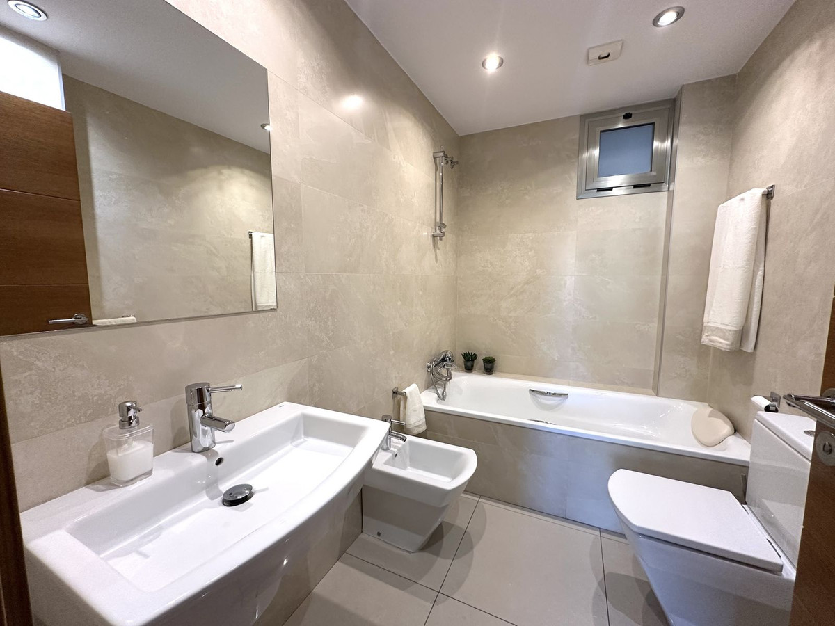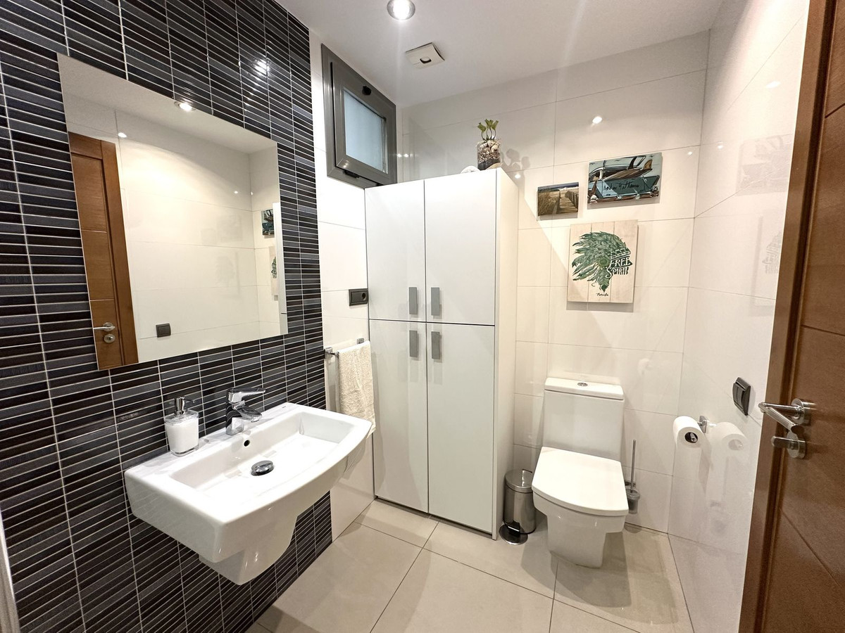 From the terrace, you have direct access to one of the well-planned bedrooms, creating a delightful connection between the indoor and outdoor spaces. Next to this room is the second bedroom. These two rooms share a bathroom with a shower. The spacious master bedroom has its own private bathroom with a bathtub and air conditioning installed. All three bedrooms feature built-in wardrobes and natural light.