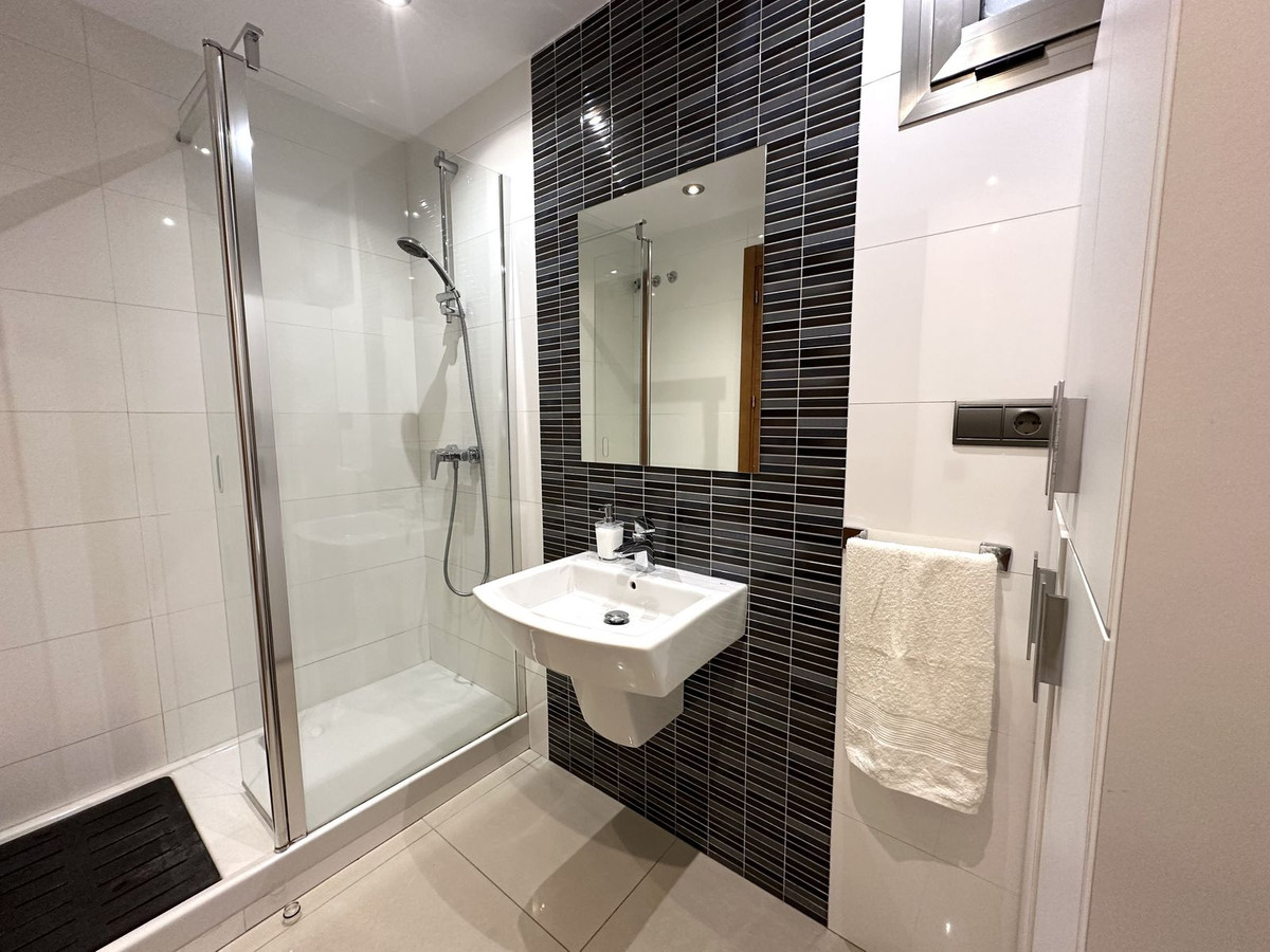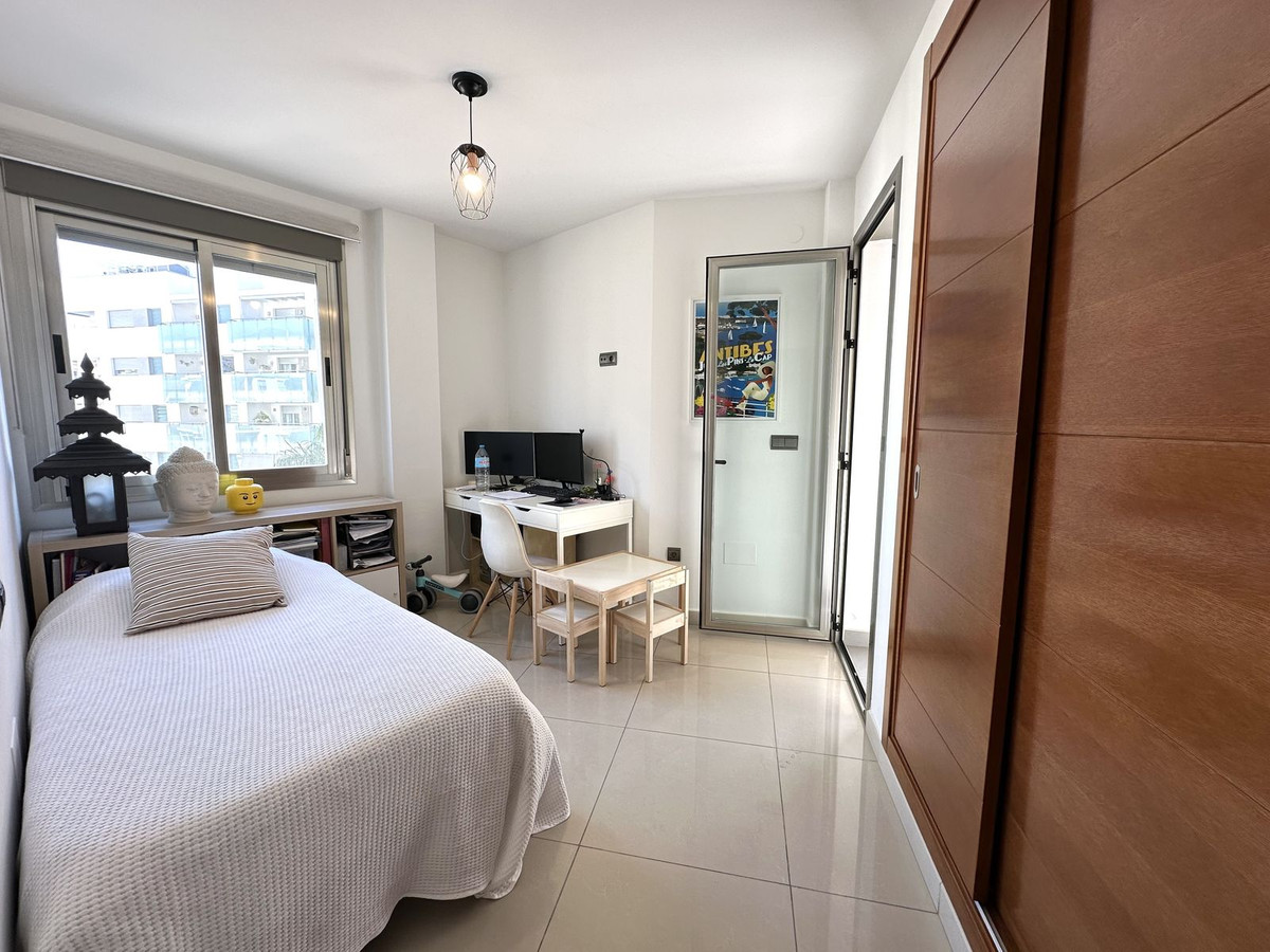 Upon entering the apartment, you are immediately greeted by a spacious and inviting hallway, giving a sense of openness and a good flow, followed by the bright separate kitchen, with the living room right next to it. The living room features air conditioning to always maintain a pleasant temperature. There is potential to open up the space between the two rooms to create an open-plan layout, if desired. From the living room, you have direct access to the spacious, south eastern terrace of 23 square meters. On this wonderful outdoor space, there is plenty of room for a dining table, making it the perfect place for the family to enjoy their meals outdoors. The space has also been used to build a piece of furniture with additional storage.