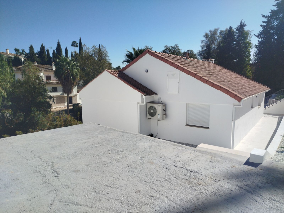 Totally renovated to a high standard and insulated with thermal insulation,you have this luxury 4 bed 4 bath villa in a quiet street in Campo Mijas with landscaped terraced gardens electric gated secure parking electric entrance gate with video entry. There are two large terraces with one surrounding the newly constructed pool. The house has two separate levels with the living room / dining room modern open plan kitchen , 2 large bedrooms both with ensuite shower and bathrooms with under floor heating and guest toilet on the entrance level with another independent bedroom with ensuite showerroom plus a large studio apartment with ensuite and storeroom on the lower level, electric blinds all water electric sewage pipes and wires are new, easy local access to all the bars restaurants of El Coto and Fuengirola set a very quiet area with video entrance and fully alarmed .