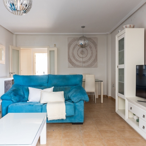 The home offers 82 m² of well-designed living space — all conveniently on one level. It features two comfortable bedrooms, a stylish bathroom with a walk-in shower, and a bright open-plan living area with a modern fitted kitchen. One of the bedrooms enjoys direct access to the private Andalusian patio, perfect for quiet mornings or warm summer evenings.