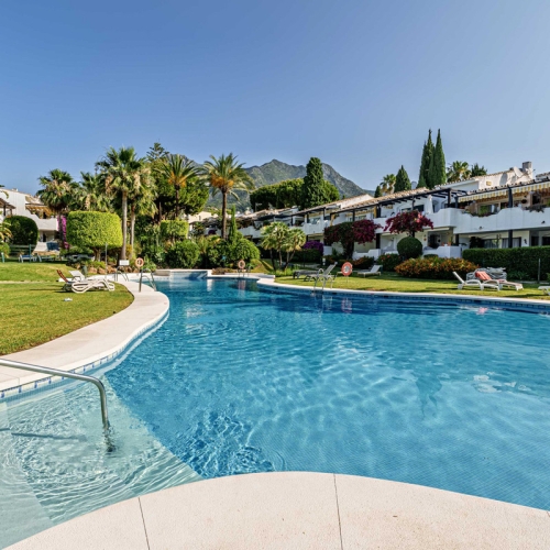 Ground floor flat for sale in the area of Nagüeles, just a few minutes drive from Puerto Banús and Marbella, in a charming Andalusian village style urbanization, ideal for families as it is close to leading schools such as the Swans International School and the British International School of Marbella, and 2mn drive to the beach of the Golden Mile.