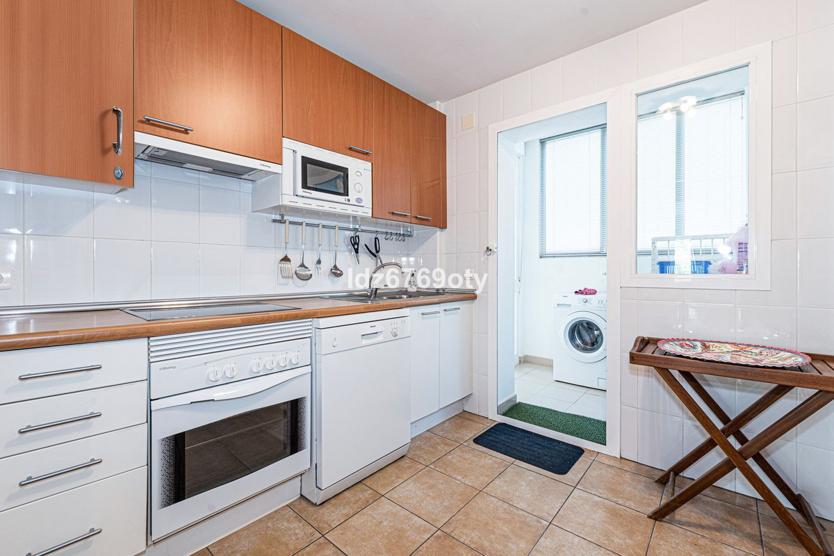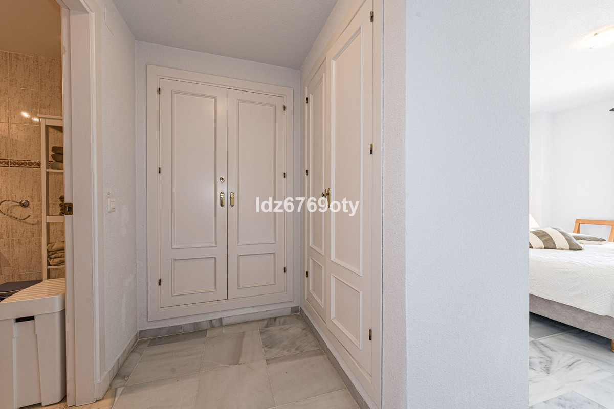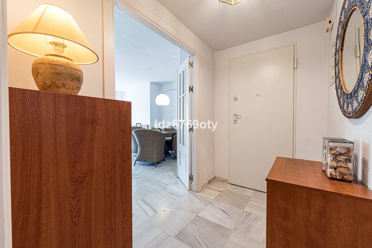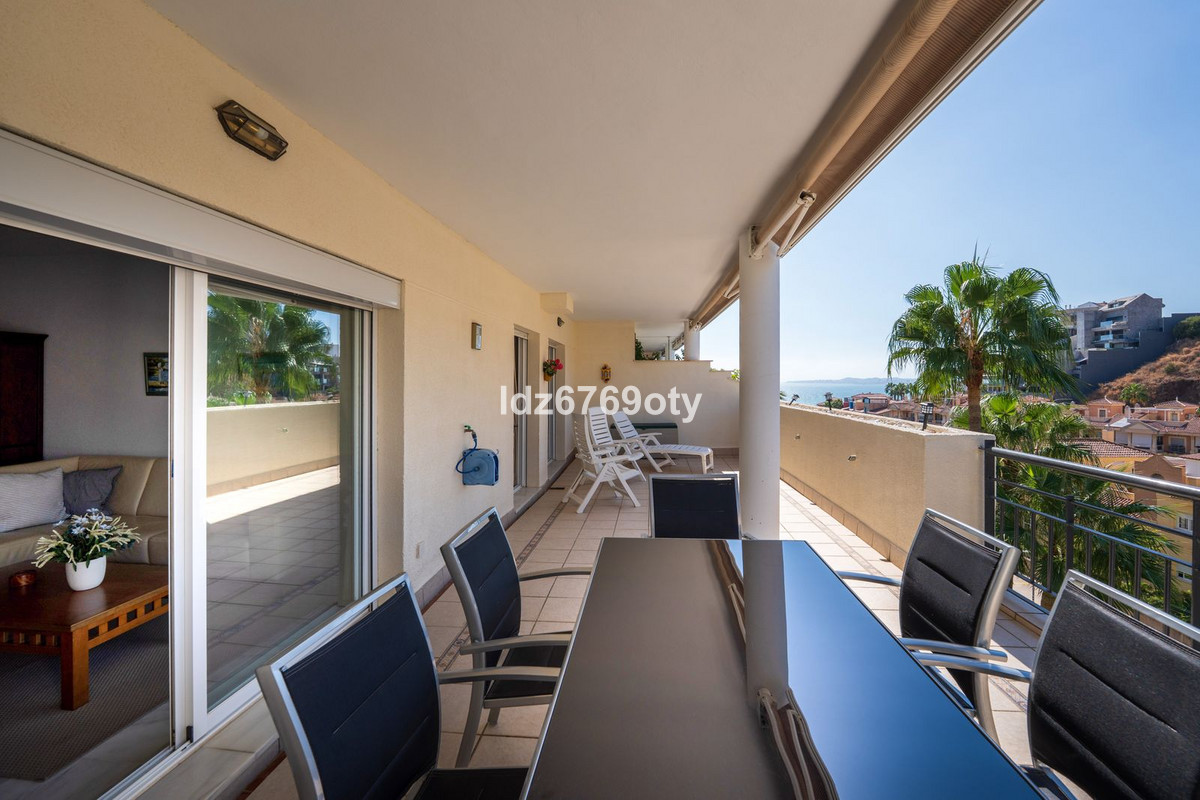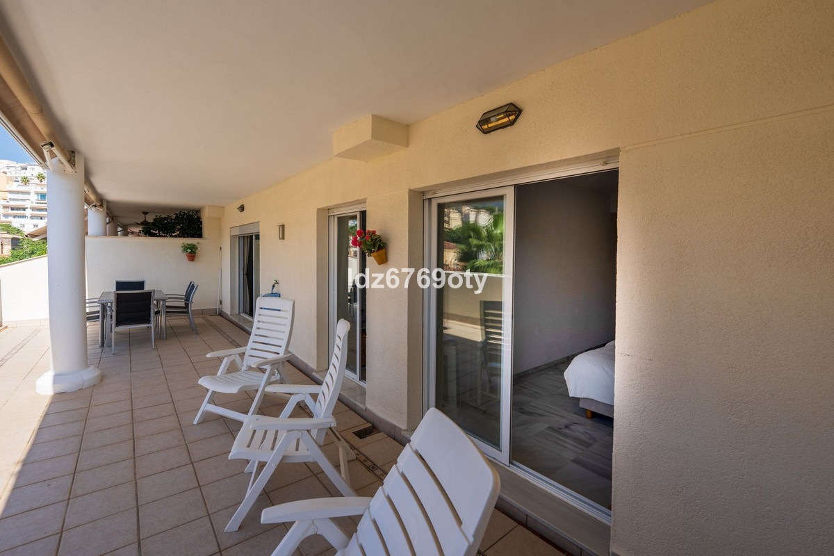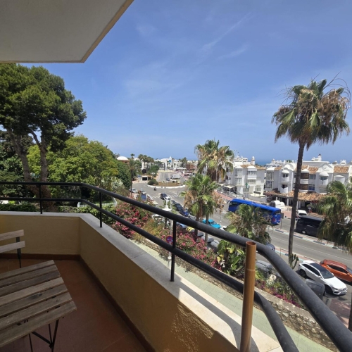 The 3-bedroom apartment, which is in excellent condition has a living area of 120m2, faces south-west and is located on the 1st floor. Through the main entrance there is a wheelchair lift to the normal lift which takes you to both the different floors and the indoor garage. The flat is therefore easily accessible for wheelchairs. The neutrally decorated flat is fully furnished, equipped with air conditioning/heating and has fast Wi-Fi. The open and spacious kitchen offers various built-in appliances, including a dishwasher, oven, microwave, fridge/freezer and a ceramic hob. From the kitchen you have access to a private patio of 35m2 wich can be used in many ways. From the dining/living room with a cosy fireplace there is direct access to the spacious terrace of 40m2 with sea views and space for both various sun loungers and a dining area for 6 people. The spacious master bedroom has fitted wardrobes and direct access to the terrace. The en-suite bathroom has double sinks, a bath/shower and a toilet. The second bedroom has fitted wardrobes and also access to the terrace and, together with the third bedroom, shares a separate second bathroom with a bath/shower and a toilet. The flat also has a laundry area with a washing machine and a dryer. In the underground car park, there is a personal storage room and 2 private parking spaces.
