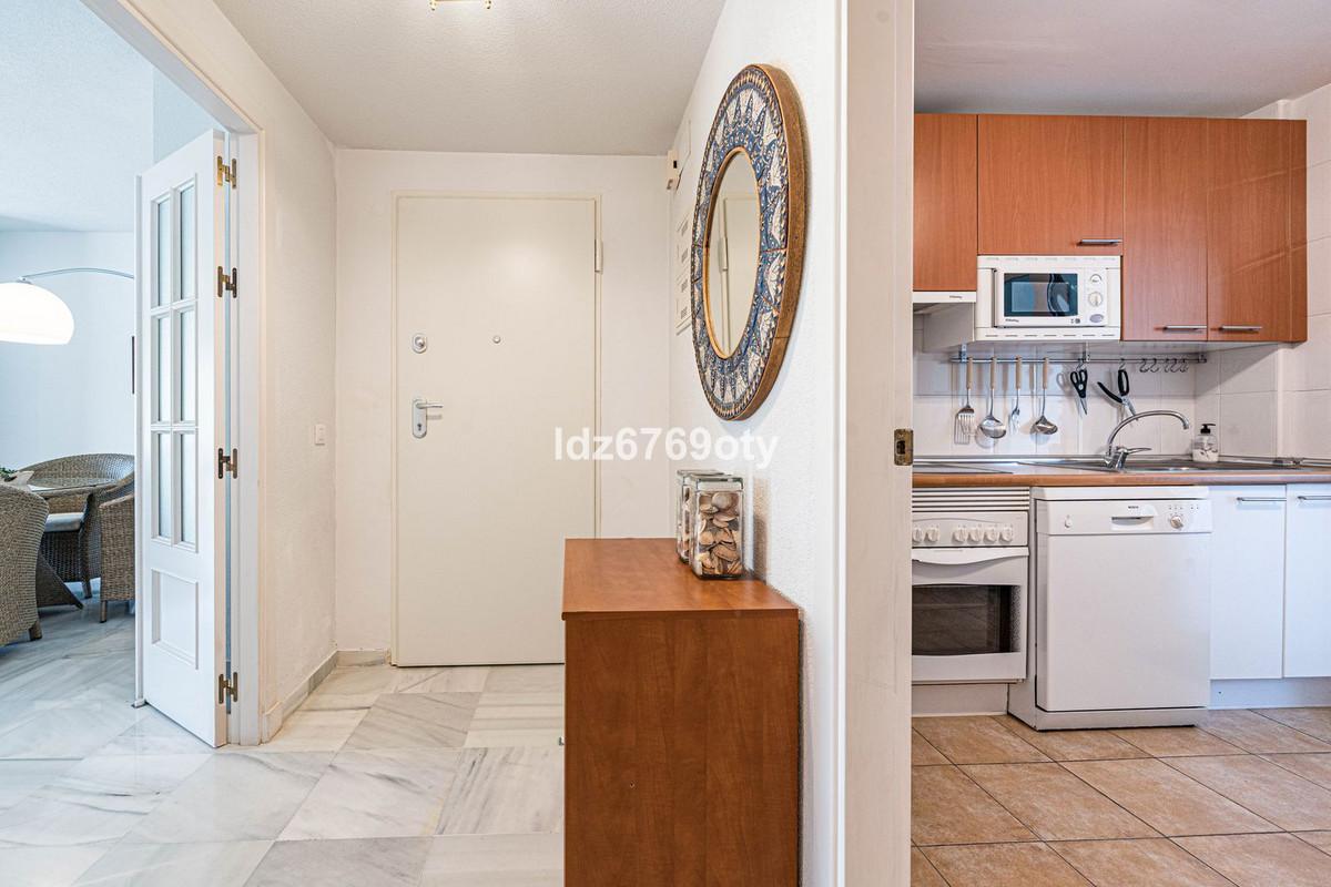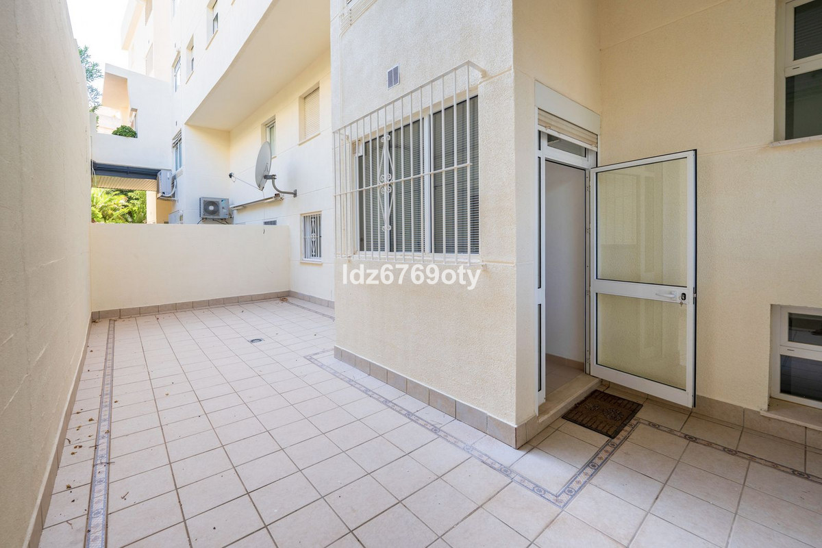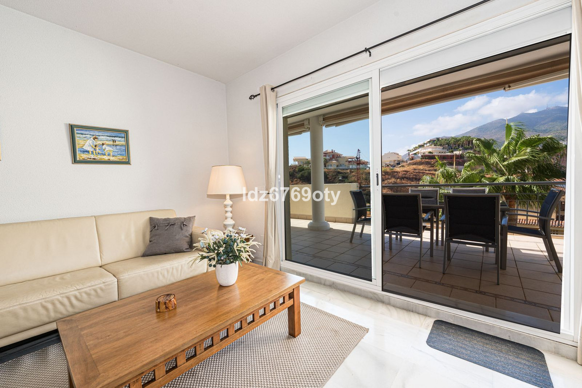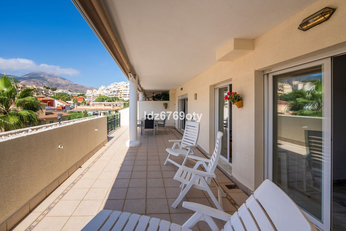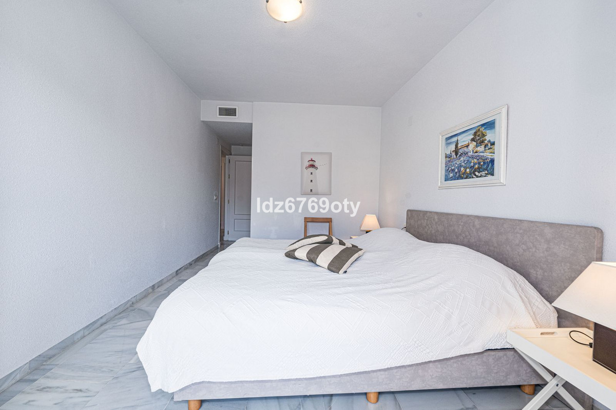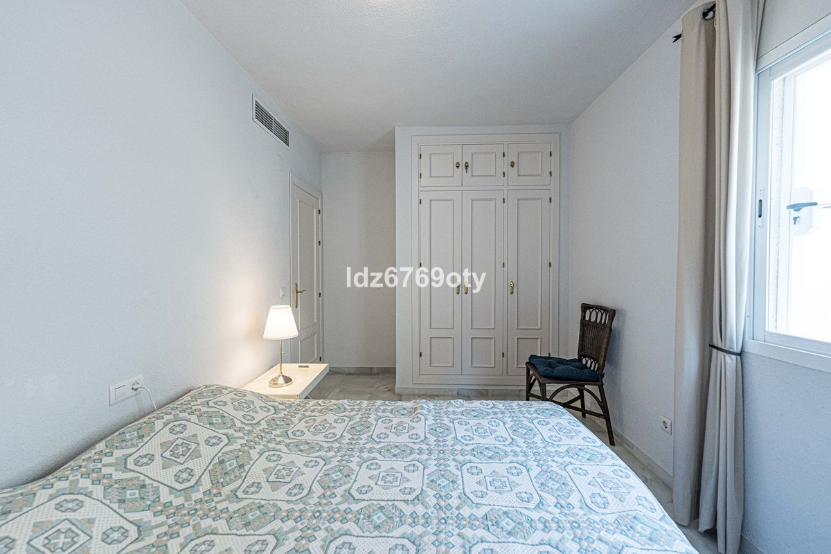The 3-bedroom apartment, which is in excellent condition has a living area of 120m2, faces south-west and is located on the 1st floor. Through the main entrance there is a wheelchair lift to the normal lift which takes you to both the different floors and the indoor garage. The flat is therefore easily accessible for wheelchairs. The neutrally decorated flat is fully furnished, equipped with air conditioning/heating and has fast Wi-Fi. The open and spacious kitchen offers various built-in appliances, including a dishwasher, oven, microwave, fridge/freezer and a ceramic hob. From the kitchen you have access to a private patio of 35m2 wich can be used in many ways. From the dining/living room with a cosy fireplace there is direct access to the spacious terrace of 40m2 with sea views and space for both various sun loungers and a dining area for 6 people. The spacious master bedroom has fitted wardrobes and direct access to the terrace. The en-suite bathroom has double sinks, a bath/shower and a toilet. The second bedroom has fitted wardrobes and also access to the terrace and, together with the third bedroom, shares a separate second bathroom with a bath/shower and a toilet. The flat also has a laundry area with a washing machine and a dryer. In the underground car park, there is a personal storage room and 2 private parking spaces.