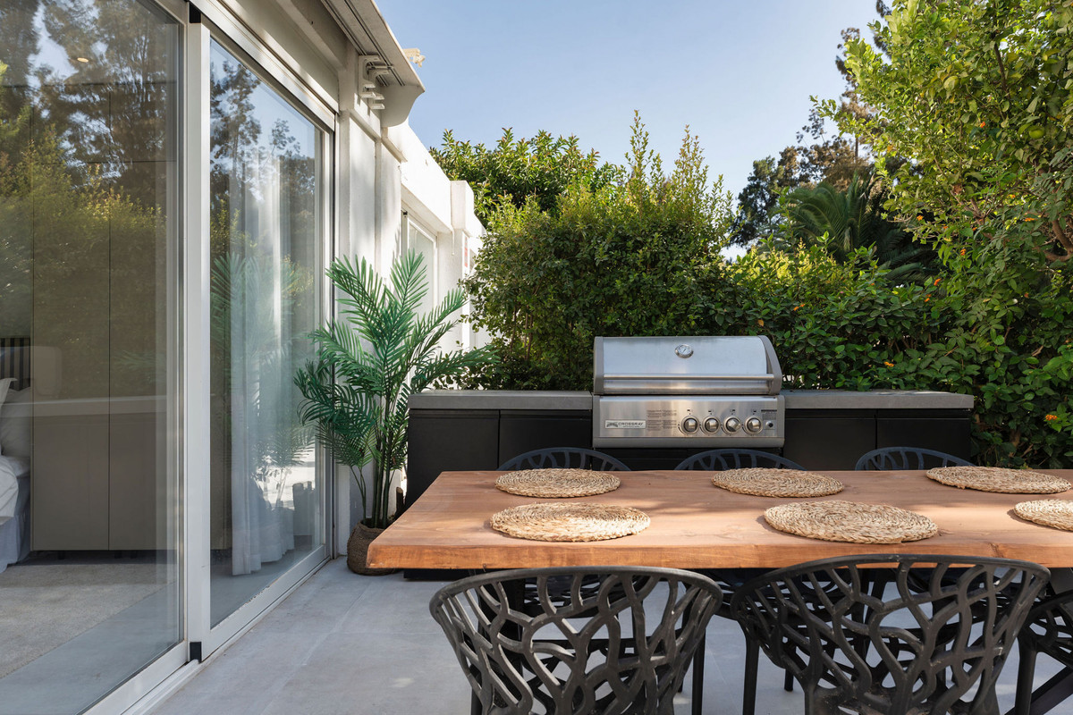 The terrace extends the living space outdoors, creating a natural transition ideal for relaxation and entertaining. With dedicated areas for lounging and dining, including a built-in barbecue, this space invites al fresco meals with stunning sunset views and the peaceful backdrop of the golf course's greenery. The kitchen, fitted with Siemens appliances, is sleek and minimalist, designed to maximize efficiency without compromising on aesthetics.
