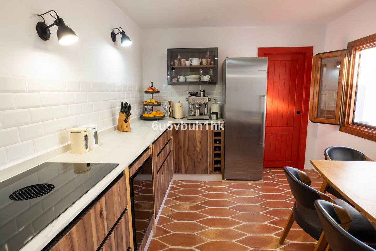 Warm ochre and white tones, terracotta floors fired in traditional kilns, and handmade tiles enhance the home's authentic Andalusian soul.
