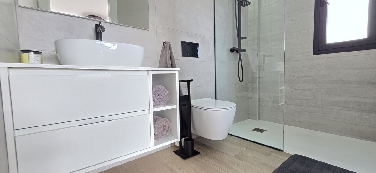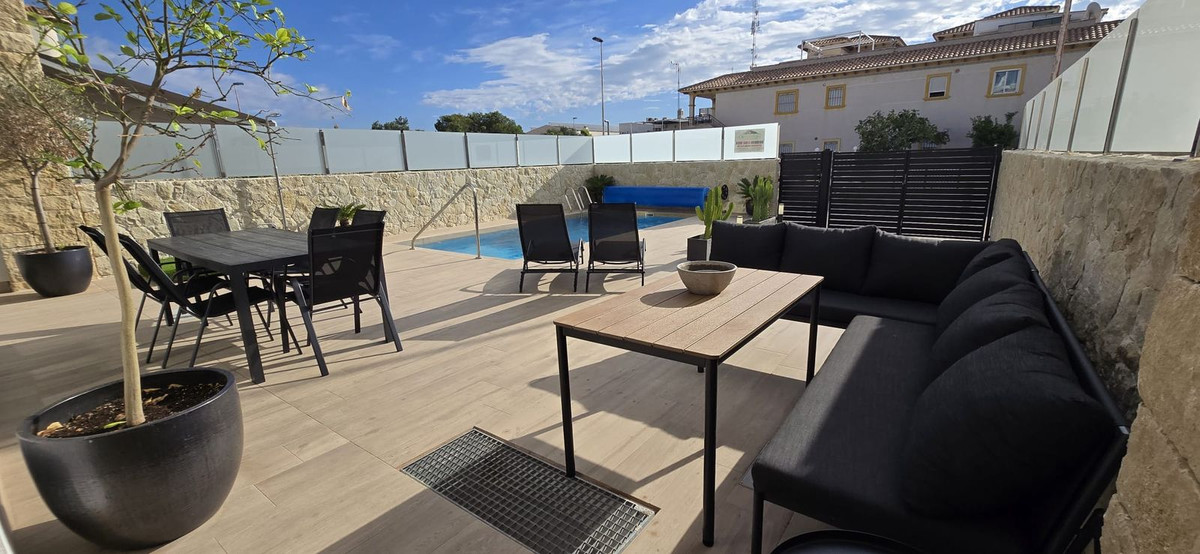 This property boasts a prime location, just a short walk from beaches, restaurants, shops, and all local amenities. It offers high-quality finishes and is distributed over three floors : ground floor with fabulos size living room and open plan kitchen, one bedroom with and Jack& Gill bathroom. On the first floor two double bedrooms with a family bathroom and the master bedroom with onsuite. Upstairs fantastic solarium perfect to spend the summer evenings. The underbuild is totally finished and has a large living room, one double bedroom, a bathroom and a laundry area.
