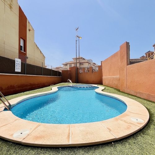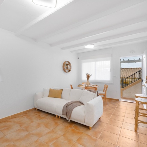 Charming corner townhouse in Ibiza style, located in Lomas de Campoamor with a south-facing orientation, offering excellent natural light throughout the day. . The property features a 241 m² plot and a 73 m² home distributed over two levels.. . It includes 3 bedrooms — two on the ground floor and one on the upper level, which has independent access from outside and a spacious solarium with sea views — as well as 3 full bathrooms. . The kitchen is integrated into a bright and spacious living-dining room with a fireplace, creating a warm and welcoming atmosphere.. . In addition, the property offers a large basement, perfect as a storage area or extra space, and a private covered parking space. . It is sold fully furnished and is located in a privileged area, close to all amenities and several golf courses.