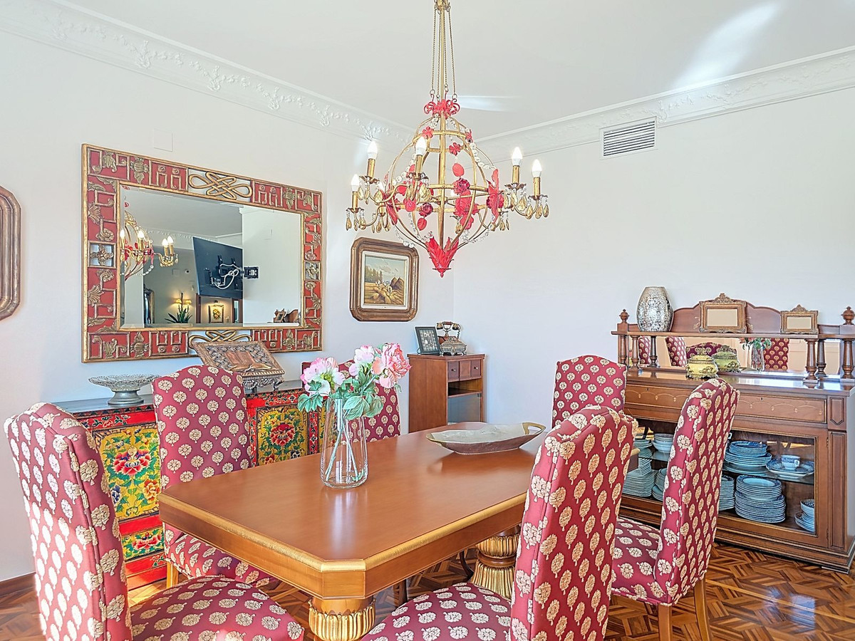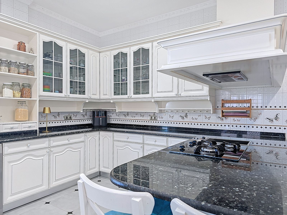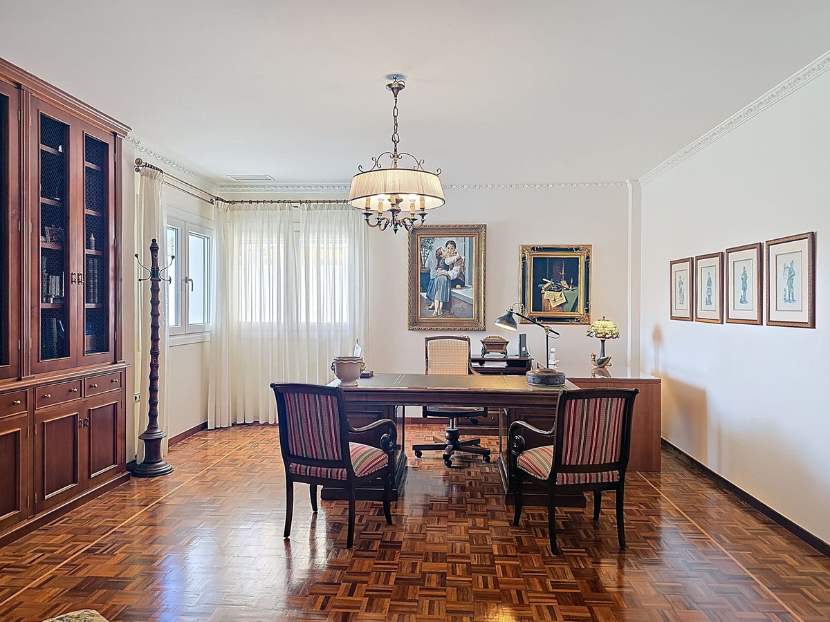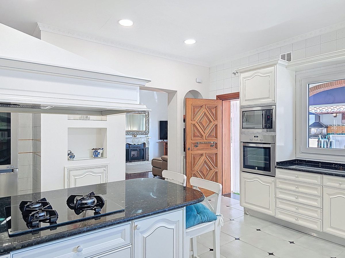 Upon entering the property, you are welcomed by an impressive entrance hall with a majestic chandelier and an exceptional sense of openness. The spacious living area exudes elegance, with a refined combination of marble floors, warm parquet accents and a cosy pellet stove. On the ground floor, there is a beautifully appointed kitchen with all modern amenities, which opens onto the sunny terraces surrounding the house. Everywhere you look, you will find places to relax or enjoy the view.