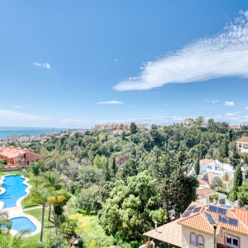 From the moment you step into the hall you are struck by the fantastic view and the natural light in the apartment. To the right there is a fully equipped kitchen with dining area and large windows overlooking the communal garden and one of the communal swimming pools. To the left there is the living room with fireplace and glass doors out onto the 22 m2 terrace with built-in sofa and space for a dining table, barbecue and plants. And did we mention that the terrace offers a fantastic view down to the sea and Fuengirola?!
