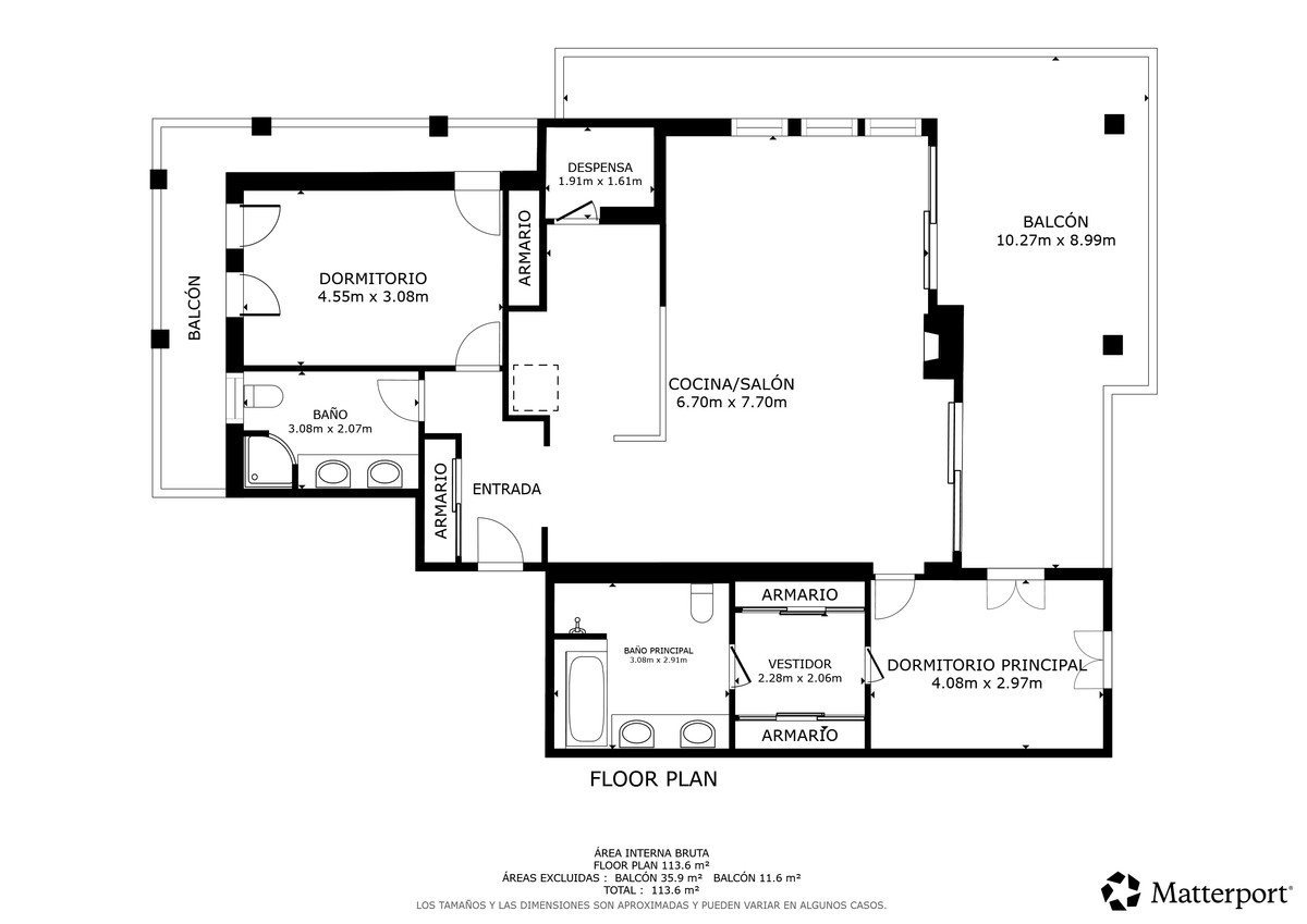Its two generous bedrooms have been designed for absolute relaxation: the master boasts an en-suite bathroom and dressing area, while the second bedroom has another full bathroom. All of this is framed by marble floors, high-quality finishes, and built-in wardrobes that bring both order and elegance.
