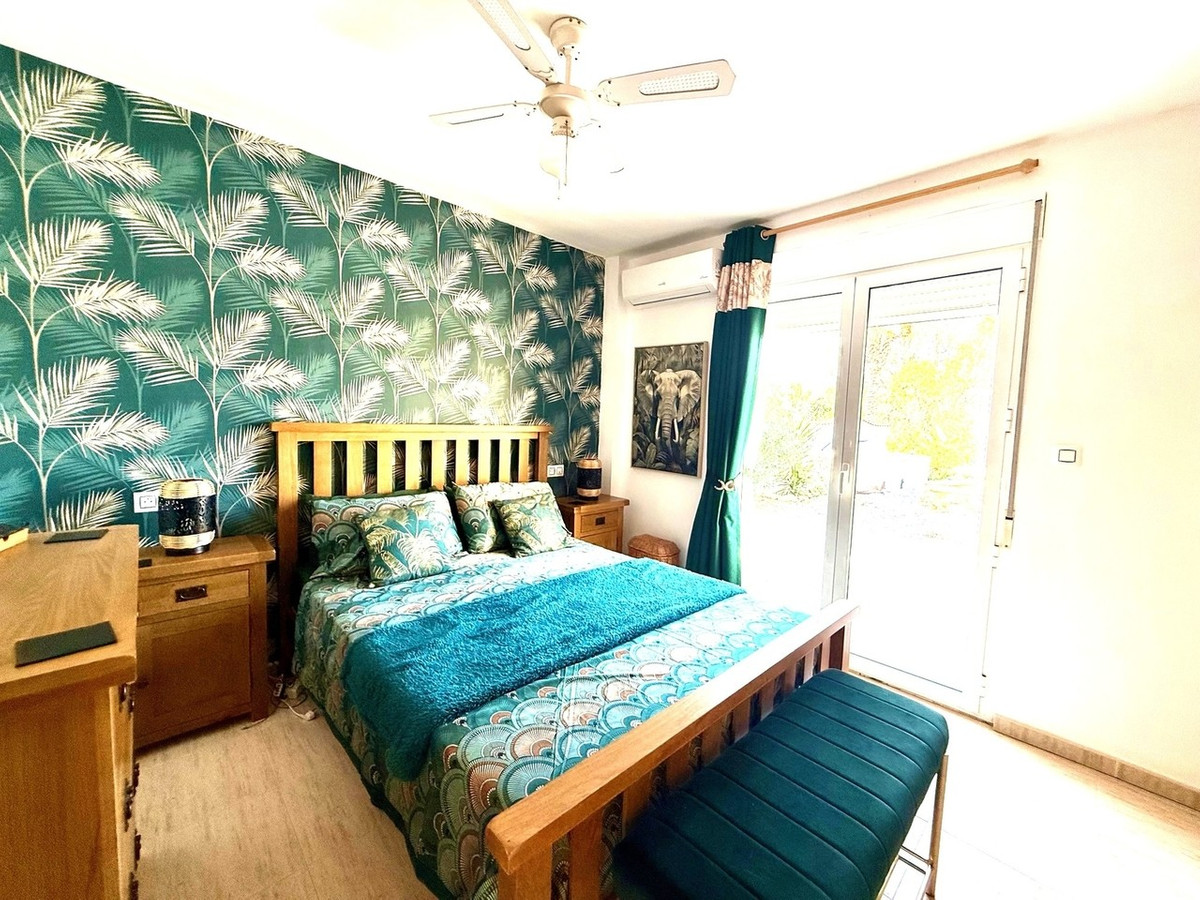 This spacious single-storey villa offers approximately 110m² of living space. The front door opens into a welcoming central hallway leading to two comfortable guest bedrooms and a modern family bathroom. The master suite features double doors opening directly to the pool area, offering beautiful views to wake up to each morning. The lounge and dining room are bright and airy, with a feature log-burning fireplace, double aspect windows, and French doors that open to the terrace and pool. The fully fitted white kitchen provides plenty of storage and workspace, with double aspect windows and an adjoining utility room with exterior access.