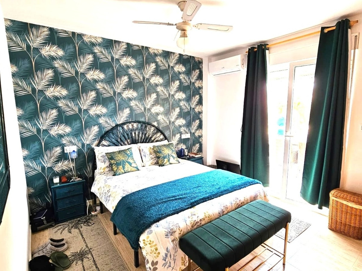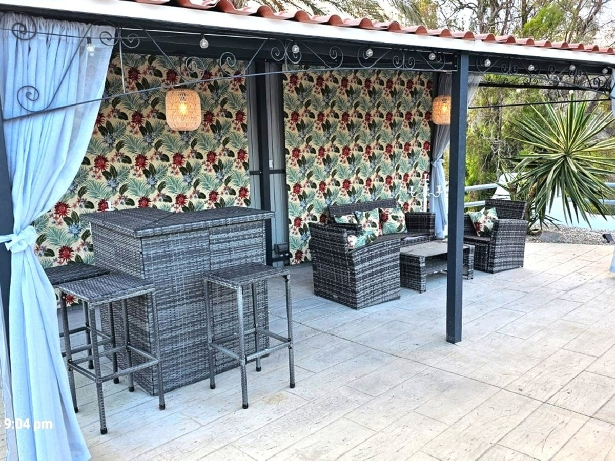 The bespoke 8×4 swimming pool is a true highlight, complete with an integrated seating area perfect for enjoying sunset G&Ts while taking in the uninterrupted panoramic views. The gardens are beautifully landscaped with gravel for low maintenance, featuring mature shrubs, palms, and trees that create a tranquil, tropical feel.