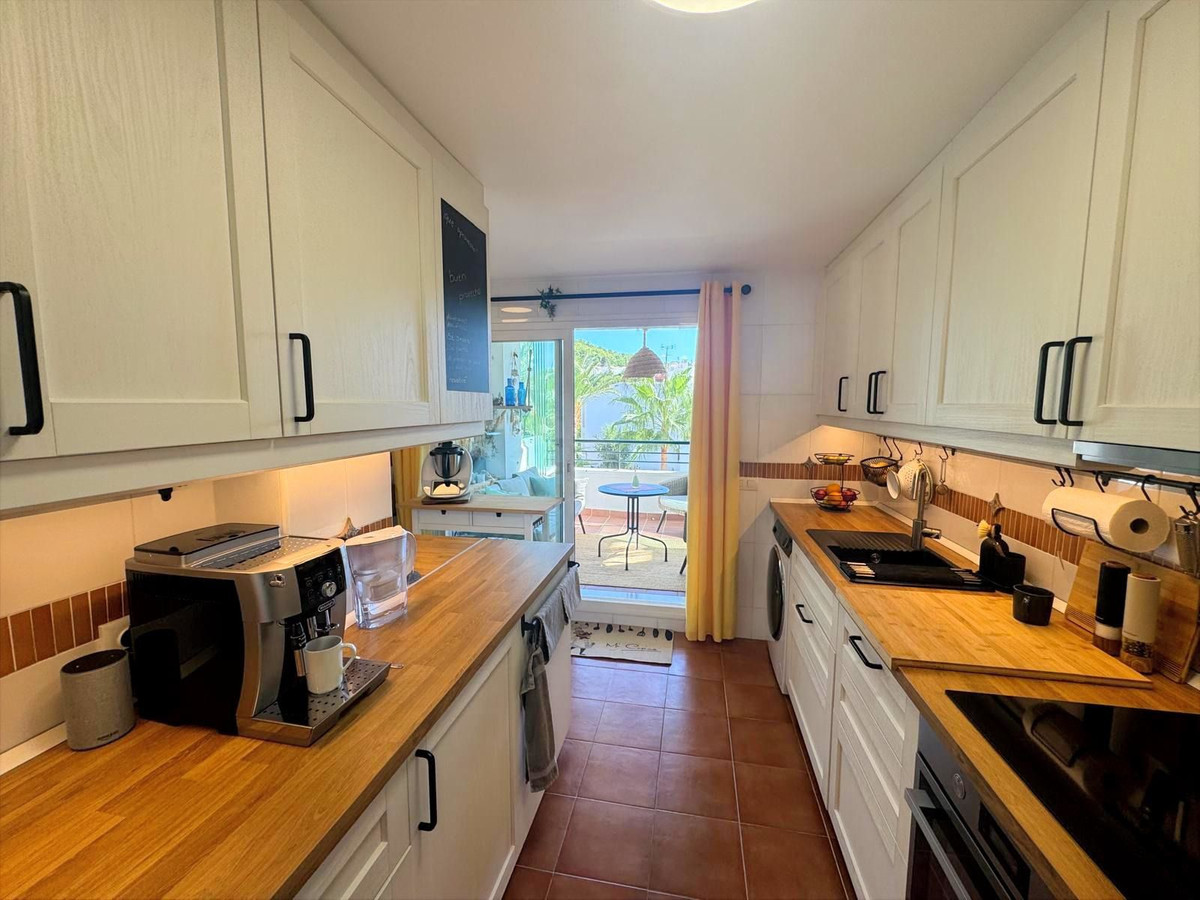 To your left, a recently refurbished, fully equipped kitchen features modern fittings and a new water boiler. From here, step out onto a charming covered terrace — a peaceful spot for morning coffee under the soft sun, with uninterrupted views of mature greenery and the fairways of Alhaurín Golf. Sheltered from the intense afternoon heat, it's also an inviting retreat for summer relaxation.