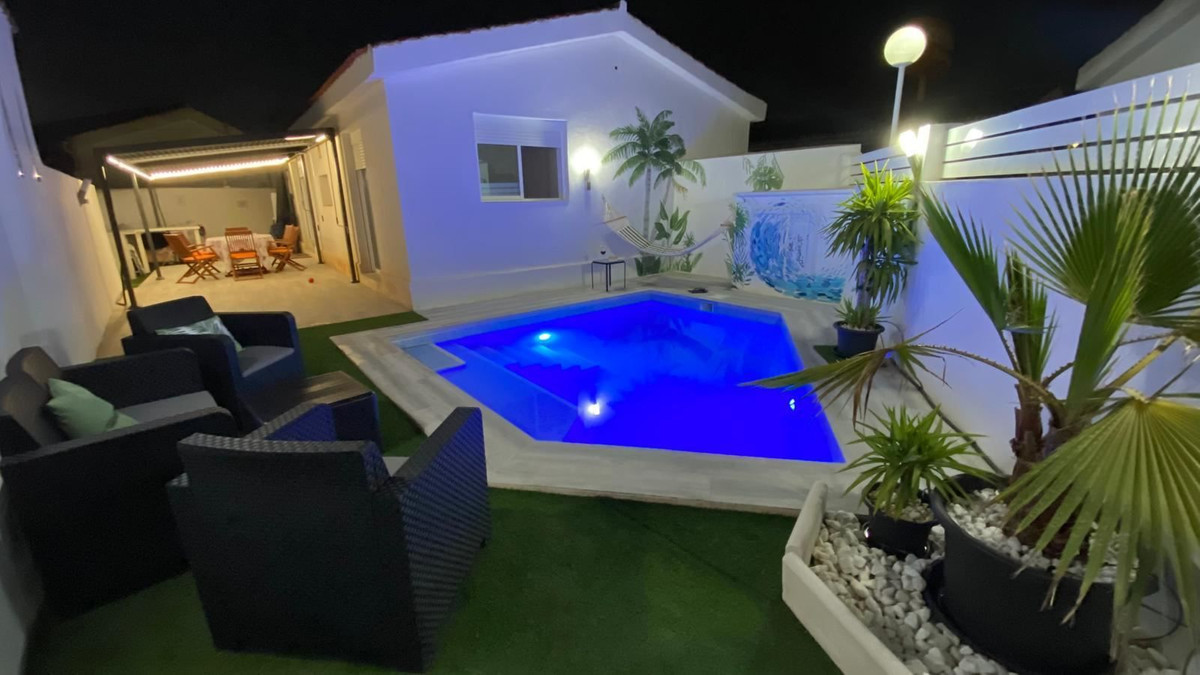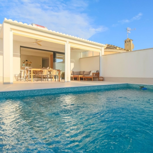 Completely renovated single-storey villa with private pool and sunny garden Welcome to a charming detached house in a sunny south-facing location – a home where you can move in immediately and start enjoying life under the Spanish sun. Here you will be greeted by a pleasant single-storey villa of approximately 70 sqm, completely renovated in 2021 with a modern and fresh feel throughout.
