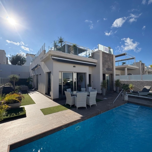 Villa with attractive corner location, private pool and roof terrace A warm welcome to this modern accommodation in an attractive location in popular Villamartin on the southern Costa Blanca. The villa built in 2019 is stylish and ready to move into, it consists of three bedrooms, three bathrooms, a guest toilet, living room and kitchen. On the plot there is a private pool, one floor up there is a spacious terrace and at the top there is the private roof terrace with a sunny location.