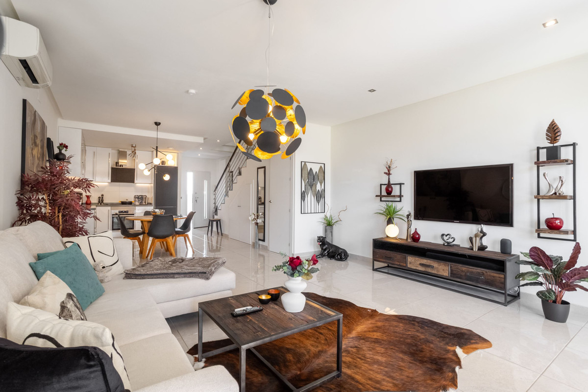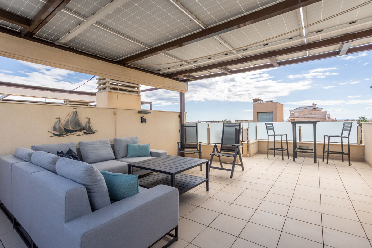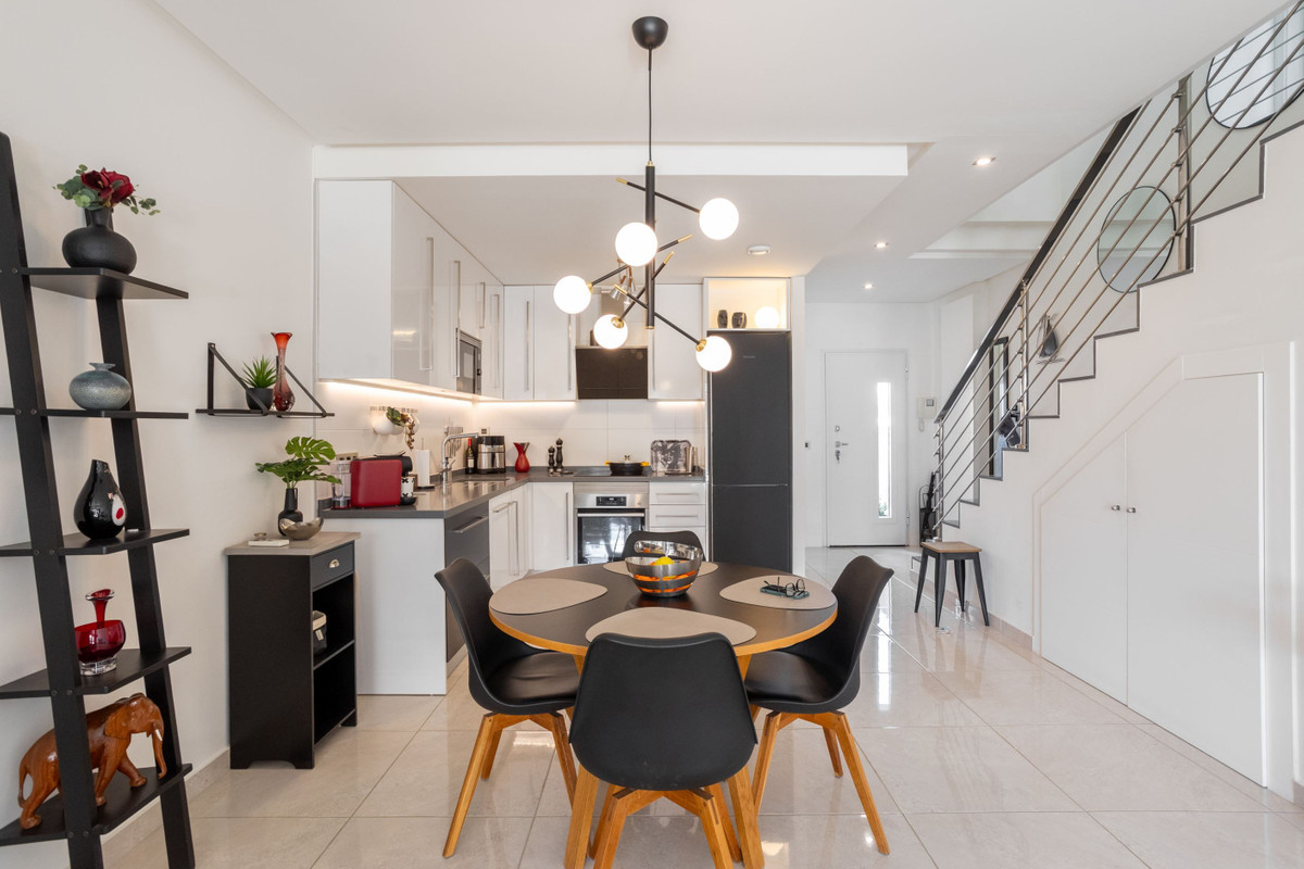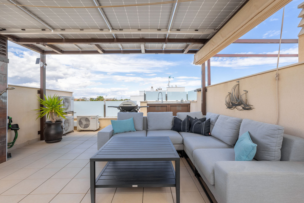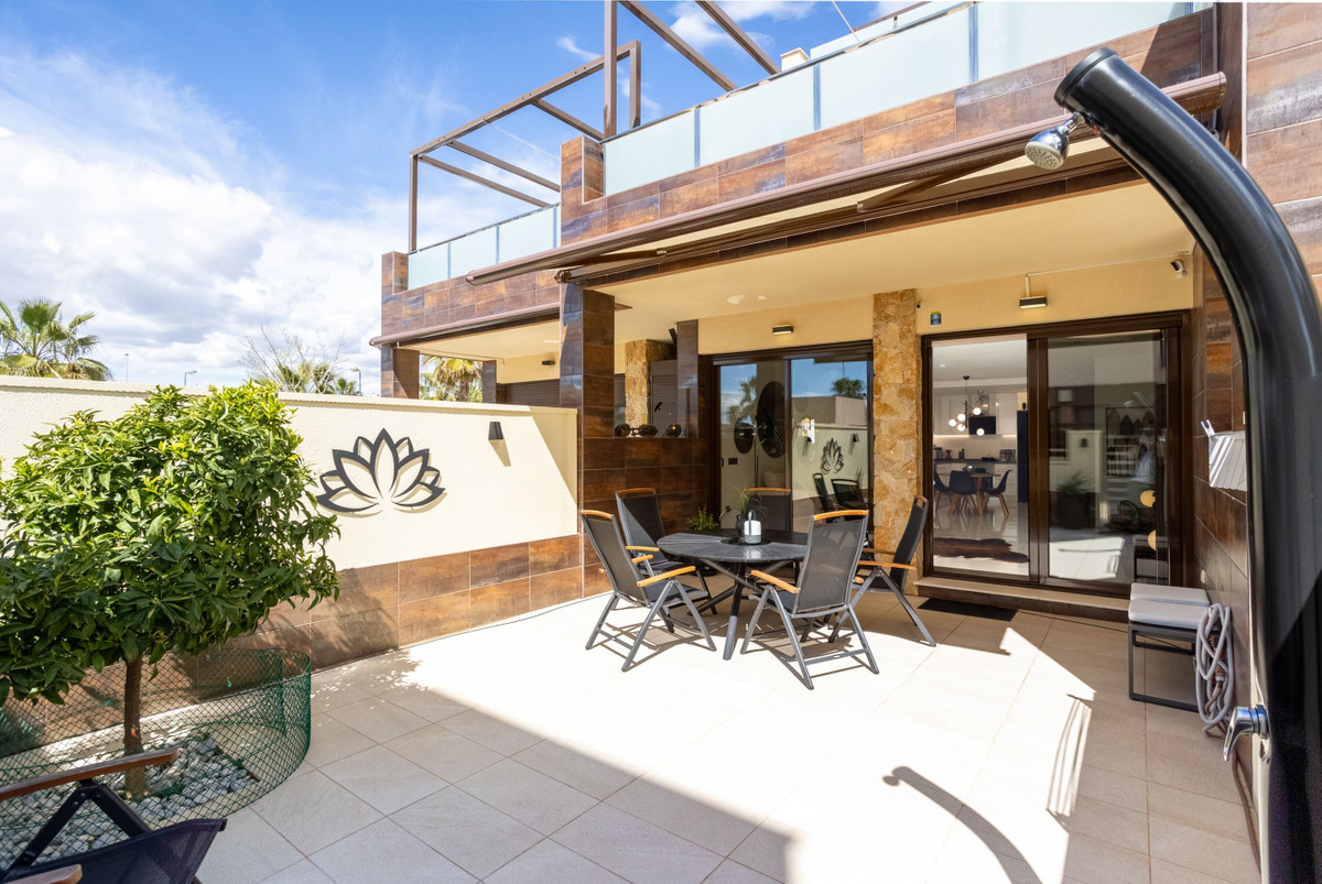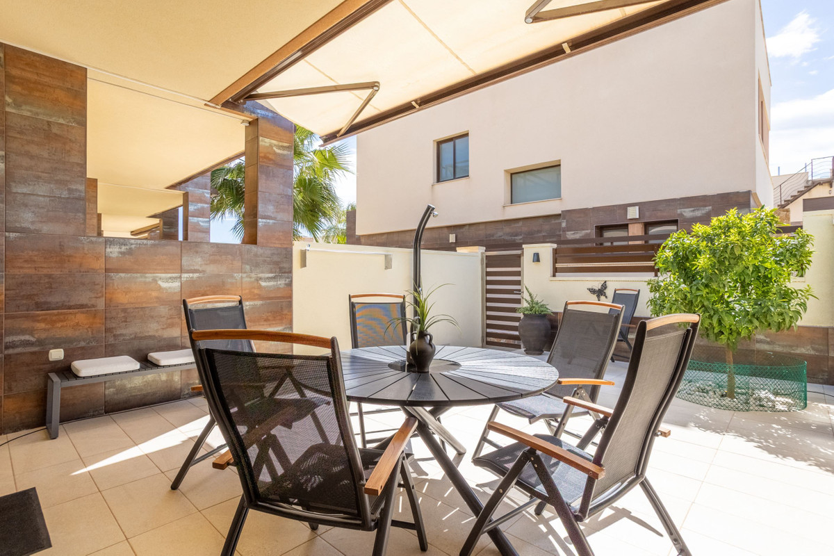 Stylish townhouse with large patios, solar panels and communal pool Welcome to this modern and easy-to-maintain townhouse that offers a comfortable and pleasant lifestyle. The home is smartly planned with two bedrooms, two bathrooms and an open-plan living room and kitchen, which creates an airy and inviting atmosphere.