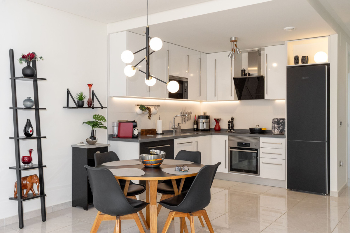 The kitchen has plenty of work surfaces and storage, stylish finishes and is adjacent to the living room, making it easy to socialize while the food is being prepared.