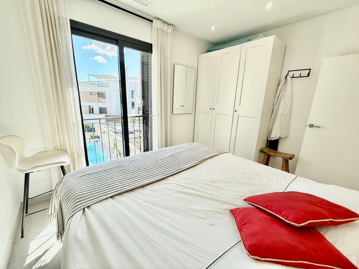 Inside, you will find a fully equipped Bosch kitchen, a bright lounge with electric louver blinds and vertical blinds, and ducted air conditioning for year-round comfort. The villa offers two spacious bedrooms, both located upstairs, each with floor-to-ceiling fitted wardrobes. The bedrooms share a modern bathroom with a walk-in shower, while a second bathroom with shower is conveniently situated on the ground floor. From one of the bedrooms, you can directly access the spacious 32 m² solarium — the perfect spot to relax or entertain while taking in the beautiful views.