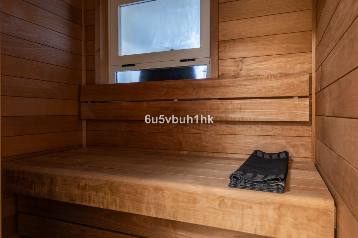 The private garden terrace offers both privacy and comfort – with a tiled, covered area enclosed by glass doors, a lovely lawn, and beautiful stone walls creating a serene ambiance.
