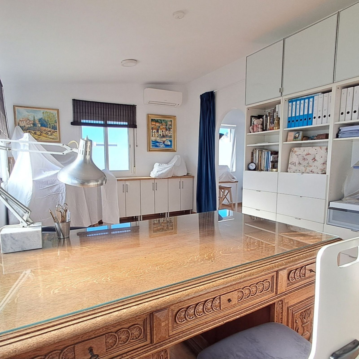 On the first floor are three bedrooms and two bathrooms. The master bedroom includes an en-suite bathroom, while the family bathroom has been fully renovated with premium materials. The second floor hosts a spacious fourth bedroom — currently used as a study — which opens directly onto an 18 m² rooftop terrace, fully refurbished in 2022, offering partial sea views and even a glimpse of Gibraltar.