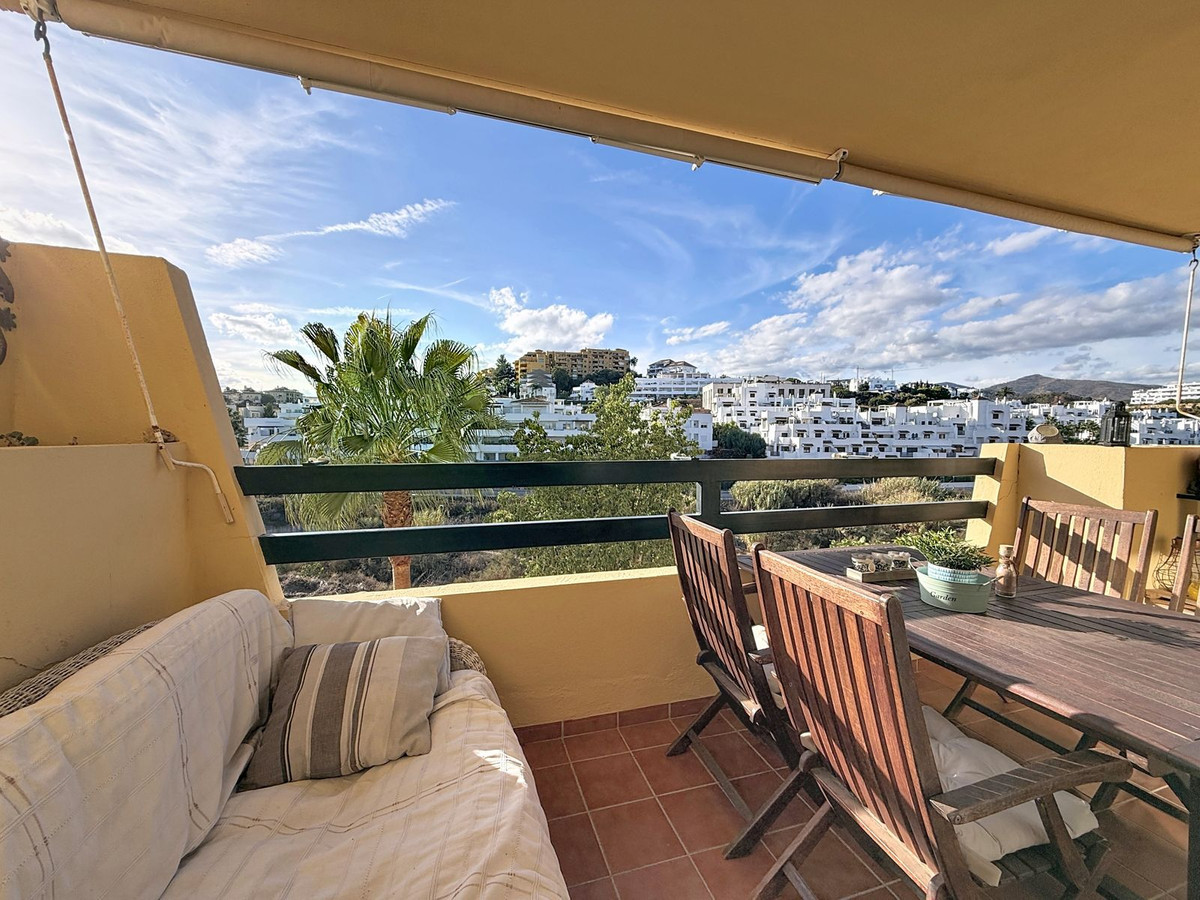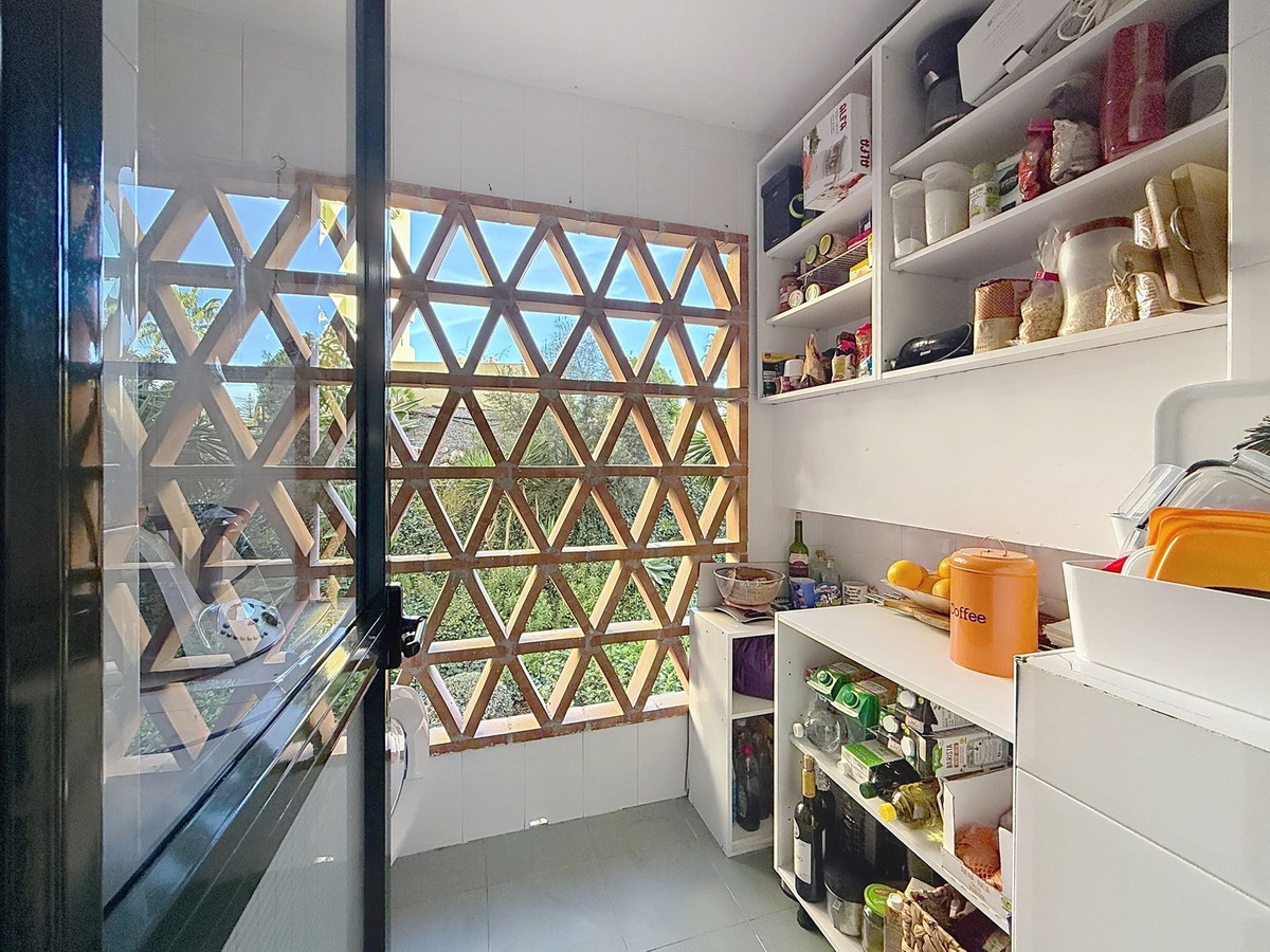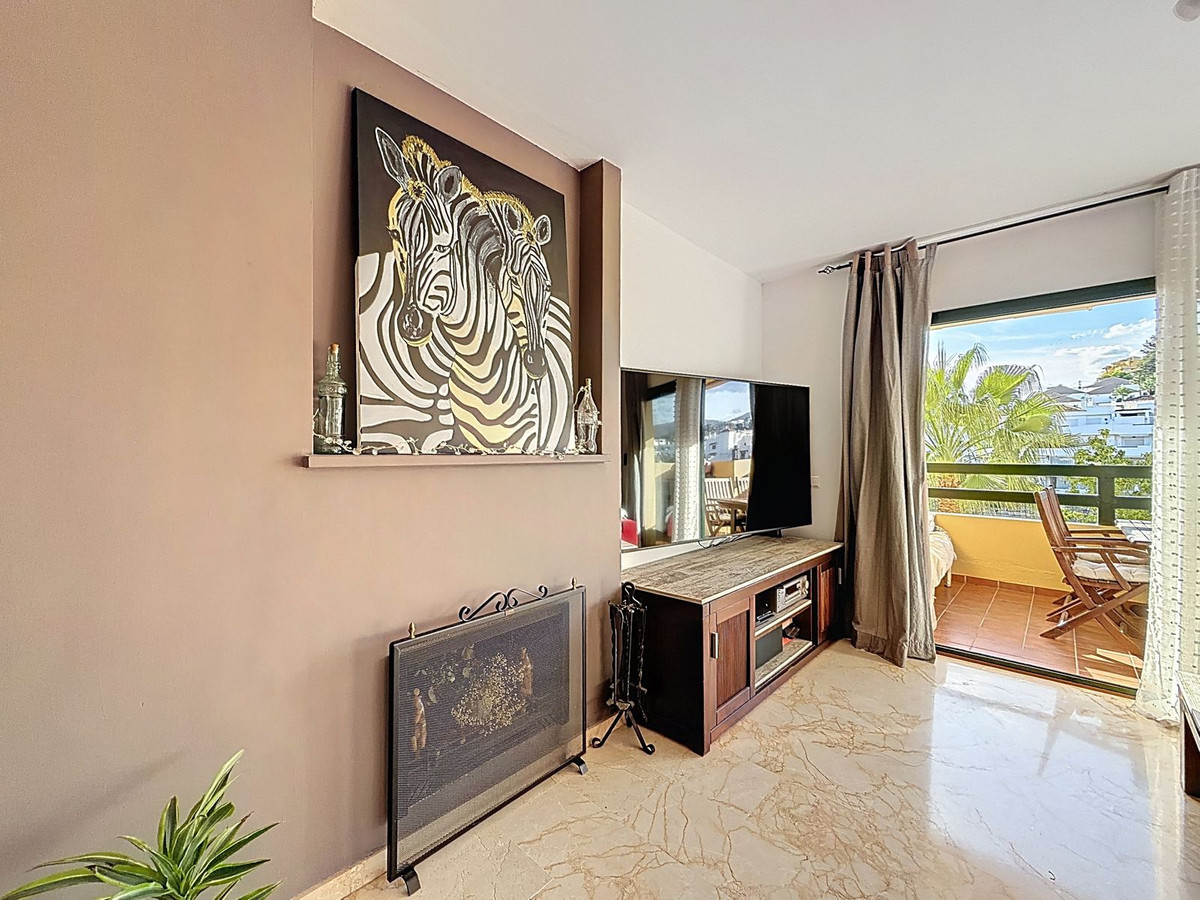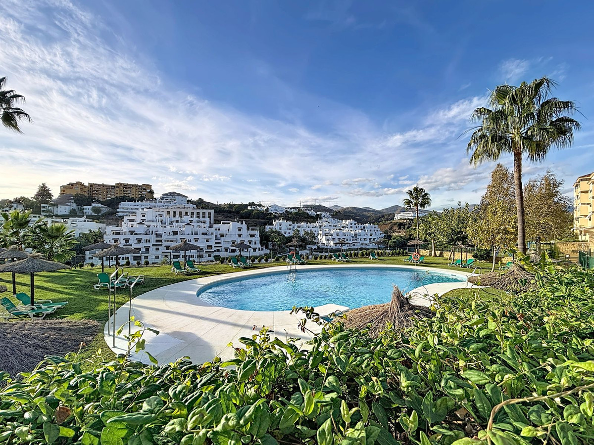 The living room stands out for its generous size and wood-burning fireplace, bringing warmth and character to the home. From here, there is access to a large terrace with open panoramic views over the gardens, countryside, and the urbanisation – an ideal space to enjoy the Costa del Sol climate all year round.