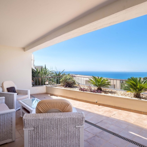 It comprises two bedrooms, both with sea views, one en suite, and another full bathroom. There is a fully equipped open-plan kitchen and a spacious living/dining room.