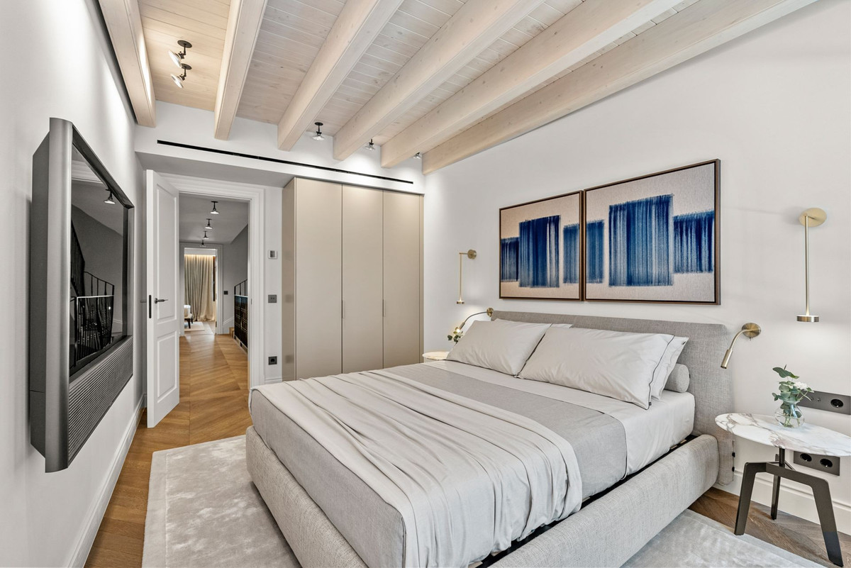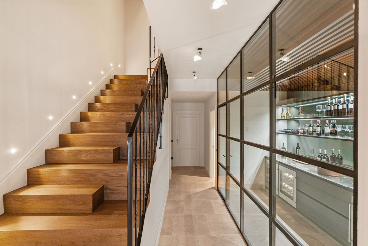 The property is also built for well-living. A heated rooftop pool makes swimming possible year-round, while an outdoor kitchen and wine cellar turn entertaining into an art. Poliform interiors and Gaggenau appliances add sophistication, and practical touches — private parking, an elevator to every floor, and advanced security — ensure comfort and ease.