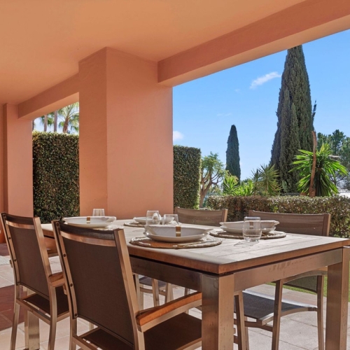 This superb 127m² ground-floor apartment offers an exceptional lifestyle where indoor and outdoor living blend seamlessly. Two spacious terraces totaling 78m², partly covered for year-round enjoyment, open directly onto the garden while offering open views of the Mediterranean and Gibraltar, a rare combination at garden level.