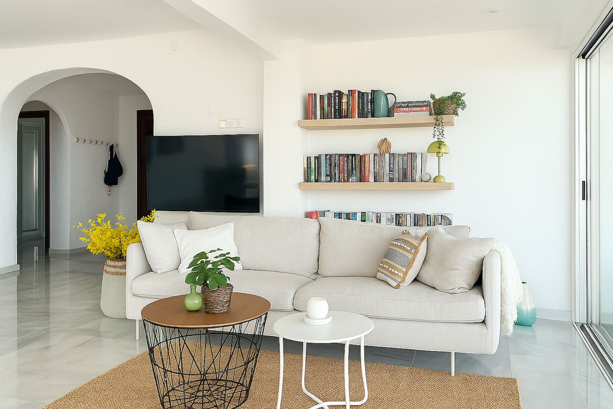 The open-plan living area connects seamlessly to a fully fitted kitchen and a covered terrace, creating the ideal setting for both relaxing and entertaining.