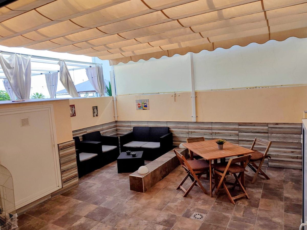 At the back, you'll find a functional patio with a countertop (including electrical sockets for outdoor cooking), a laundry room with a Junkers butane water heater, a utility sink, and plenty of shelving.