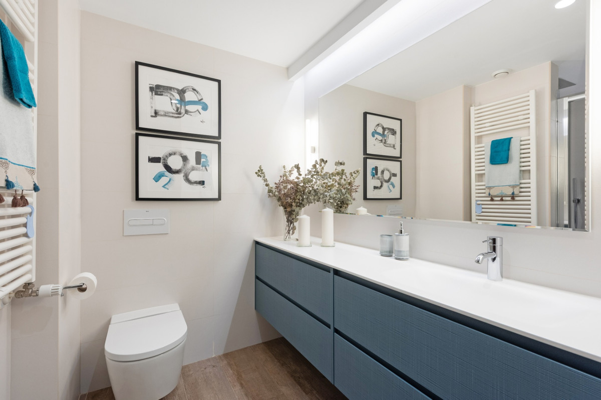 The open-plan kitchen, equipped with high-end appliances from the Neff brand, harmoniously integrates into the living area, creating a modern and sophisticated atmosphere. It also features an independent laundry room with a washer and dryer.