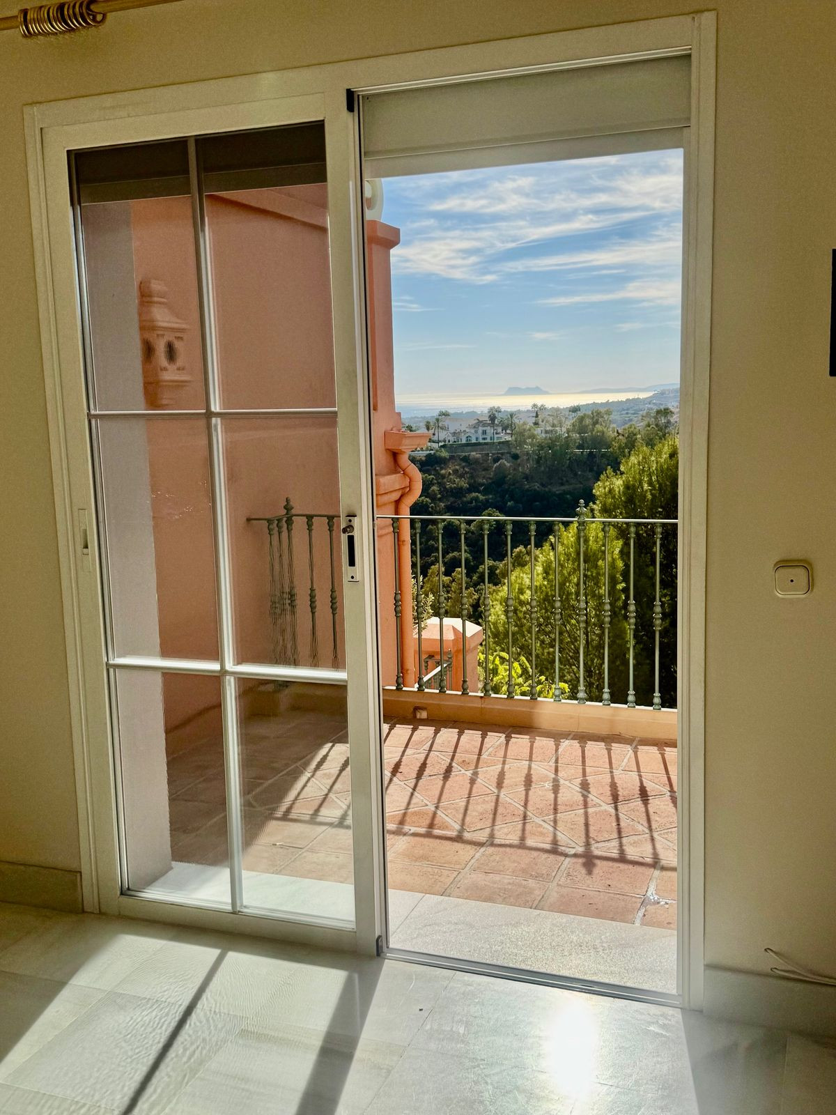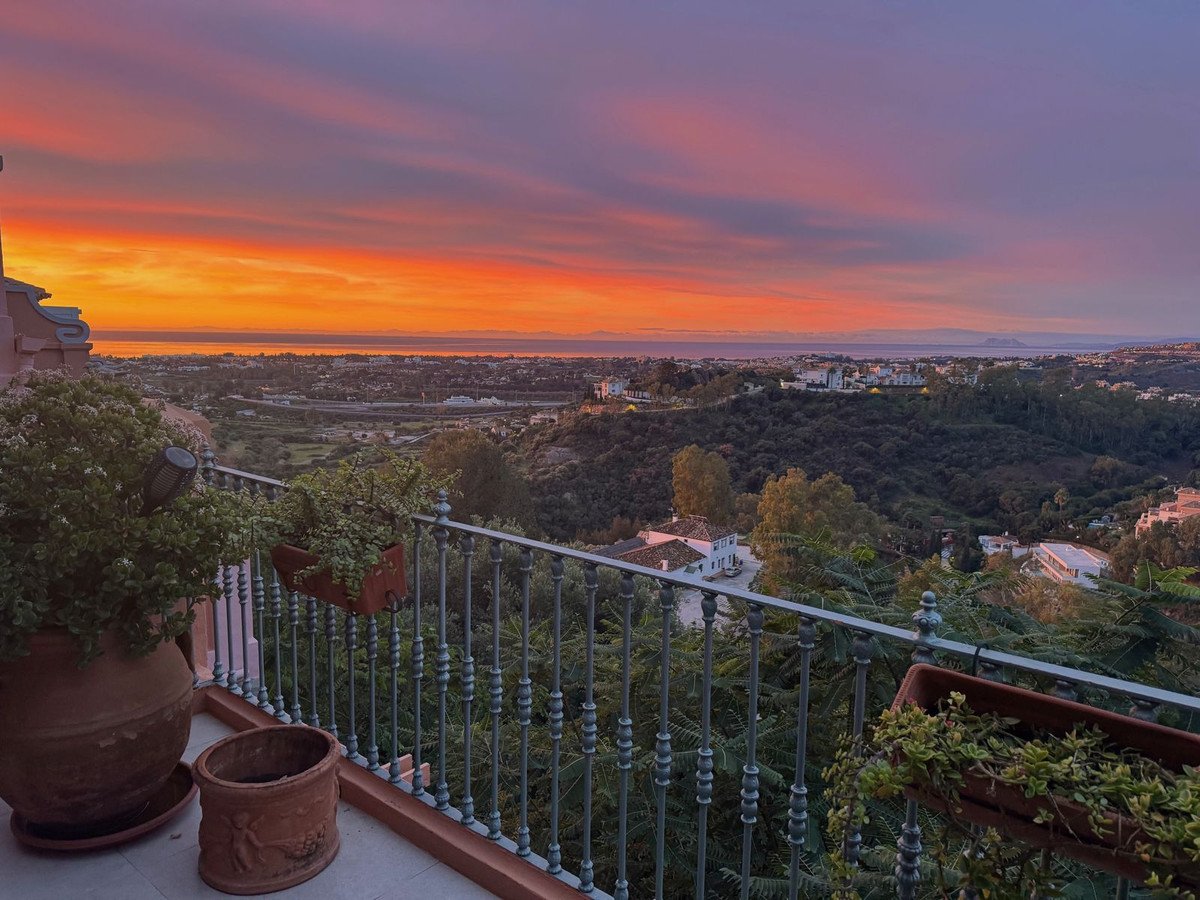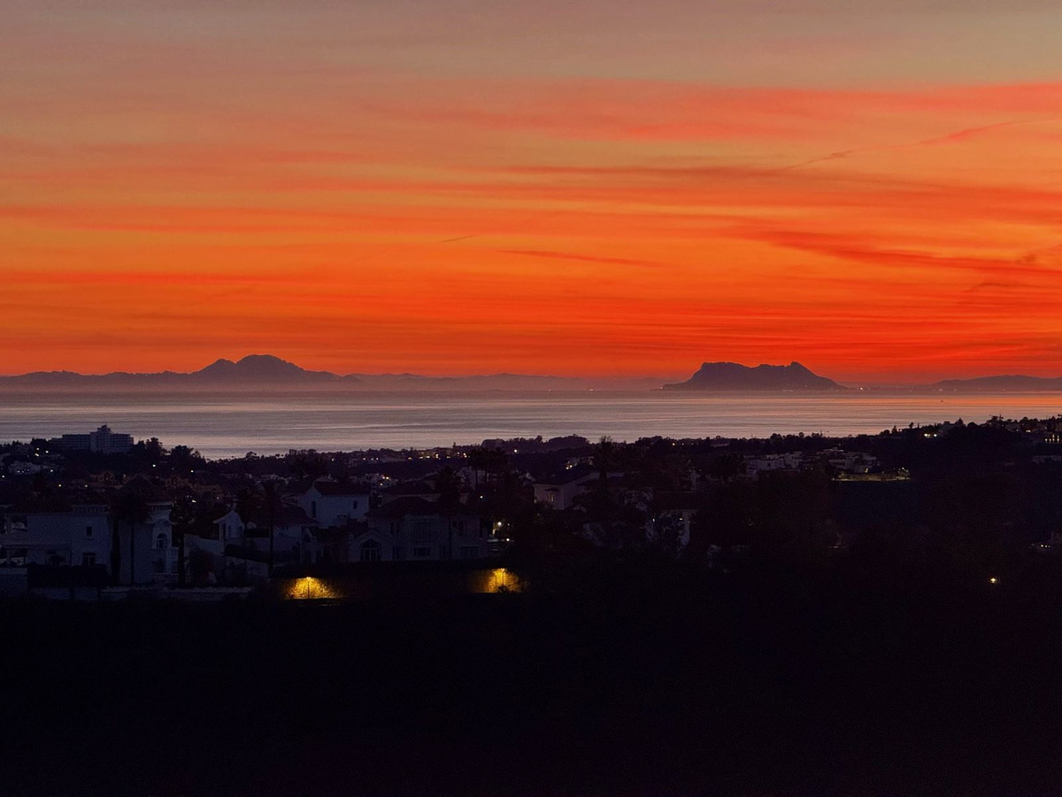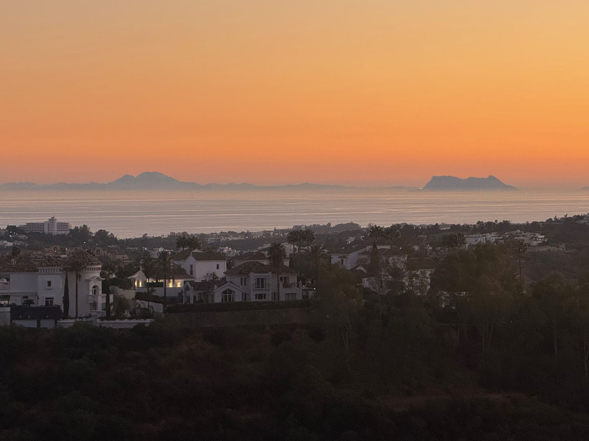 As you approach the entrance, you go up a few steps that lead to the front door. Upon entering, you'll be greeted by a spacious and light-filled dining and living area, accentuated by floor-to-ceiling windows that create an inviting atmosphere. Step outside to your expansive 22m² covered terrace, which features glass curtains, allowing you to enjoy the stunning panoramic views of the area of Benahavís, the majestic nearby mountains, the iconic Rock of Gibraltar, and the sparkling sea. The beautiful open South-West views provide a sense of comfort all year round to the mind and soul; on clear days, you can even catch a glimpse of the African coast and the Atlas Mountains—truly breathtaking! The sunsets from here are spectacular.