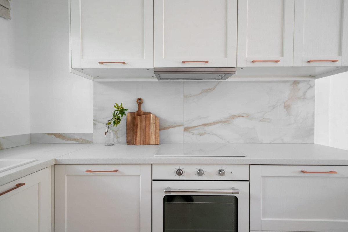 open-plan living room and kitchen. The fireplace in the living room adds a cozy touch, perfect
