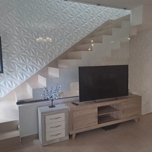 On the ground floor, you'll also find a modern shower room for convenience. Upstairs, there are two generously sized double bedrooms with fitted wardrobes and a family bathroom. The main bedroom benefits from direct access to a lovely private terrace—ideal for enjoying the sunshine.