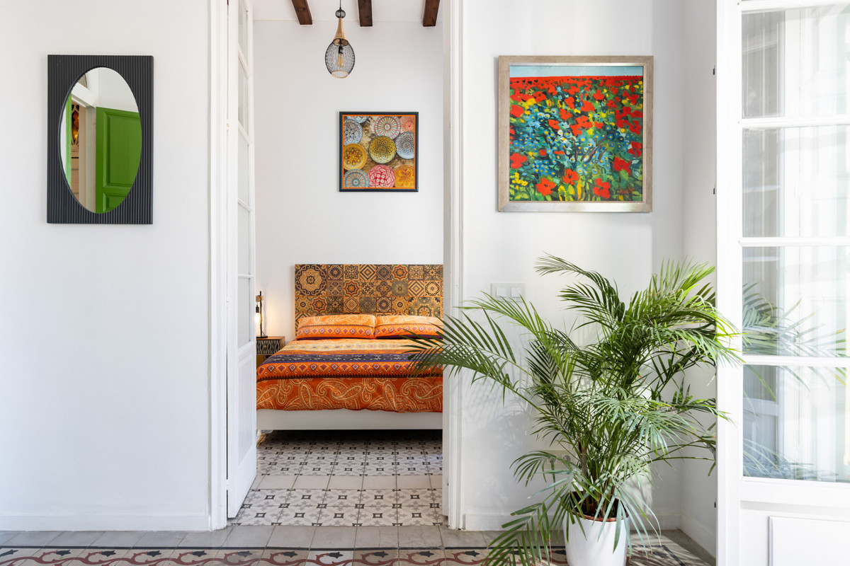 Impressive 4.2-meter-high ceilings with exposed beams, 3-meter doors, and original 19th-century tiles anchor a high-end renovation that honors the building's heritage while enhancing everyday comfort. The spa-style bathrooms offer generous dimensions and rain-effect showers; central air conditioning serves the entire residence. The versatile layout allows for an independent studio or three-bedroom apartment, at the moment, it's functioning as an Airbnb, making this ideal for guests or additional income as a short-term rental.
