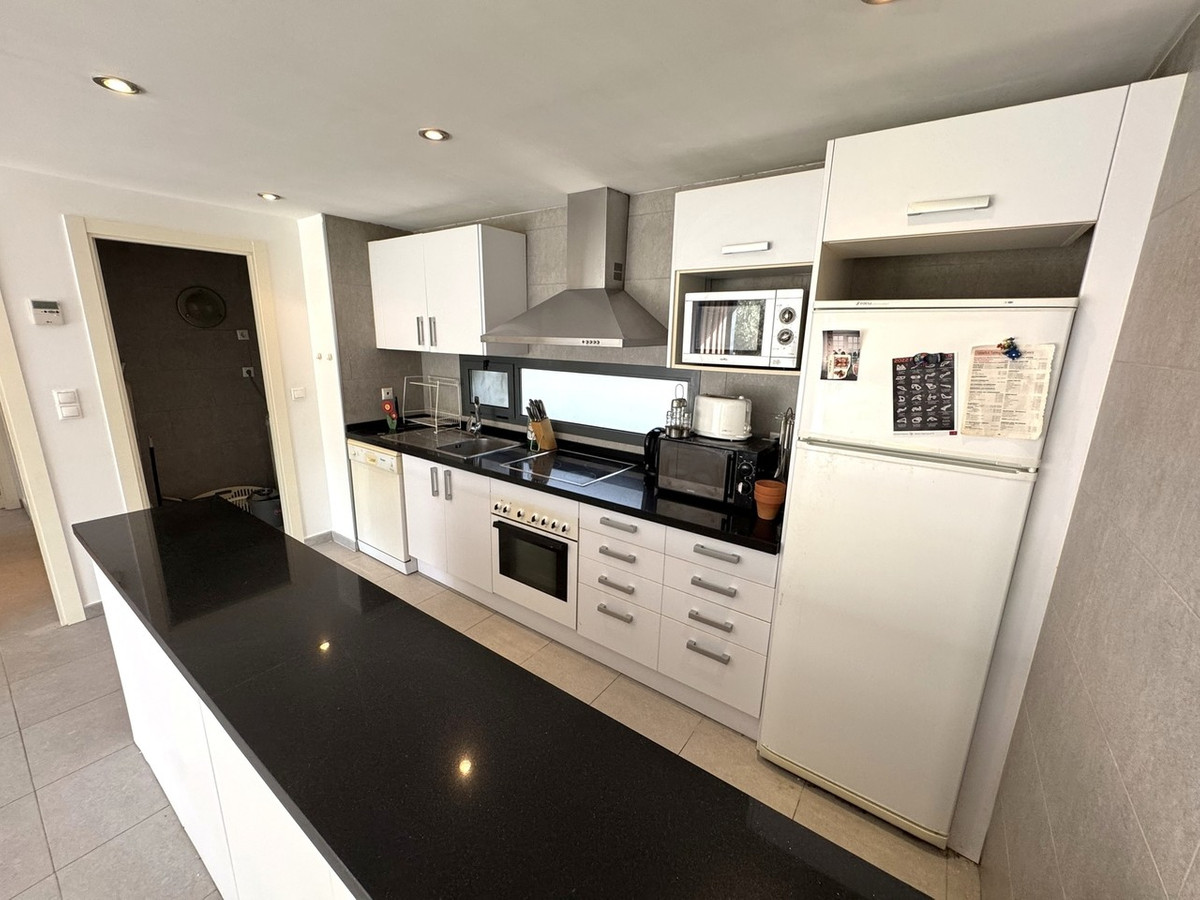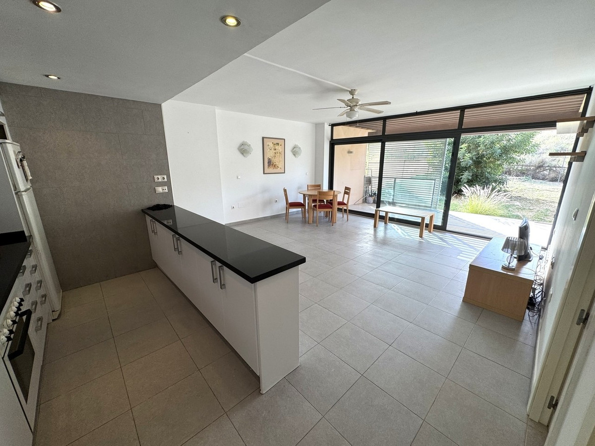 Inside, the apartment opens into a bright and spacious open-plan living, dining, and kitchen area, filled with natural light from the large patio doors that lead directly to the private terrace and garden of approximately 140m².
