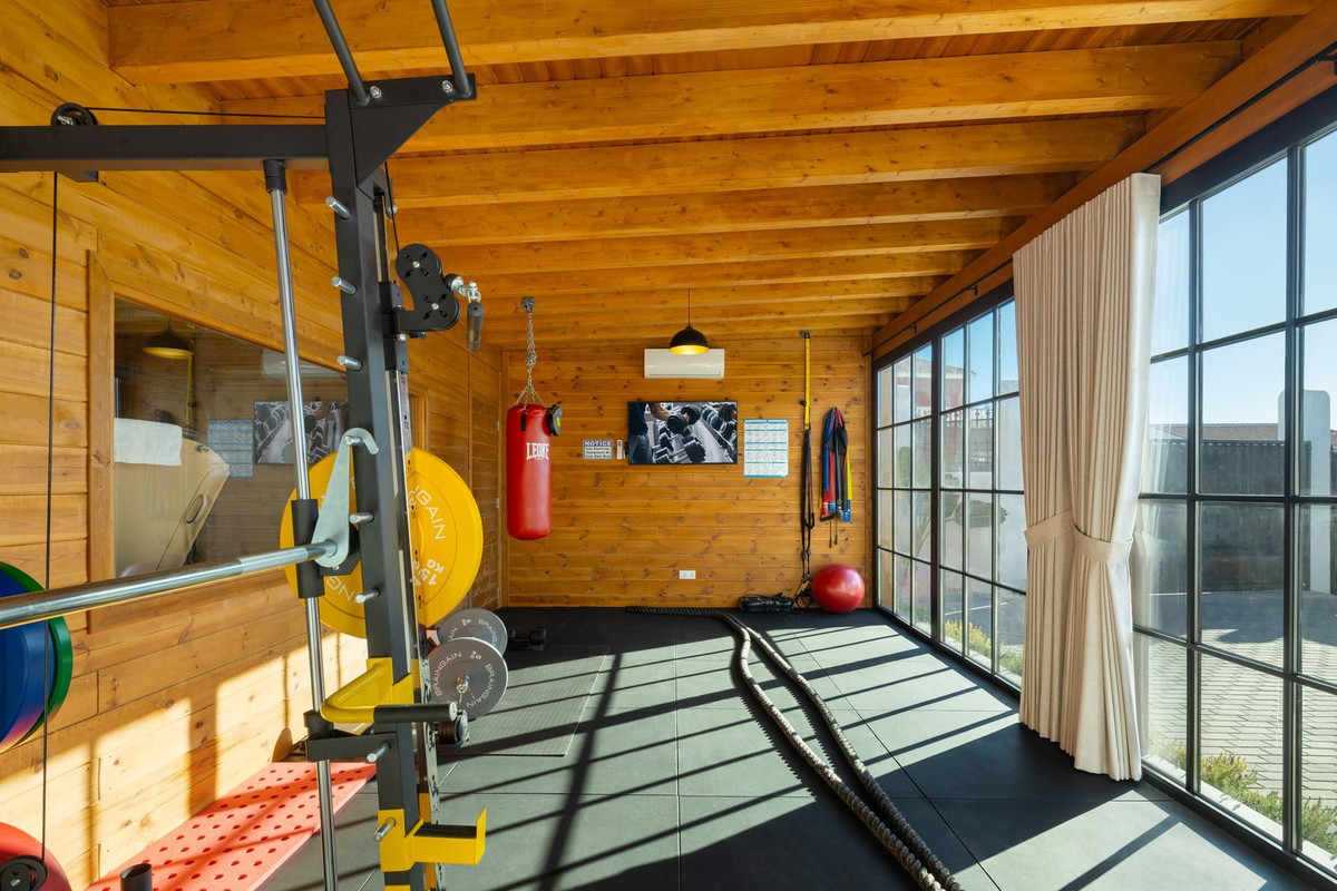 Additional highlights include an air-conditioned gym, fitted wardrobes, laundry room, storage room, solarium, double glazing, alarm system, Wi-Fi, and a private garage.