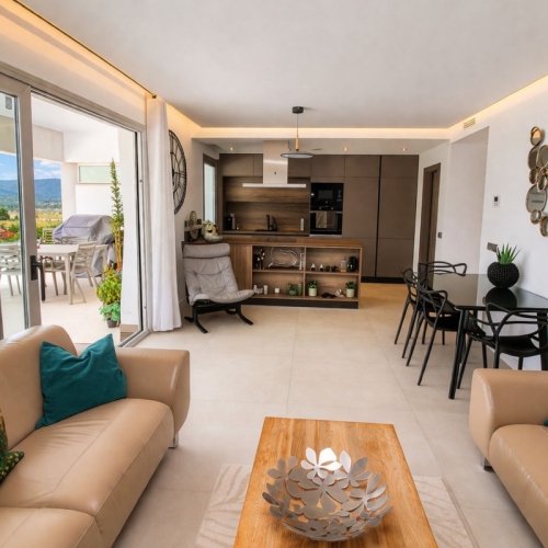This modern corner garden apartment for sale offers near idilic modern luxury living and gives the feeling of living in a new build one level villa. High quality build with modern open plan layout and beautifully decorated throughout. Entrance hall with luxury wallpaper and wood panelling in parts, leading onto main living area and all bedrooms and bathrooms.