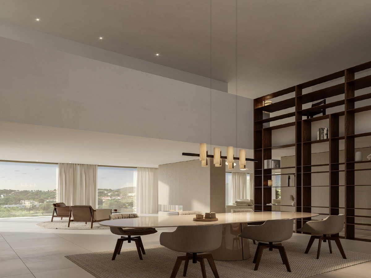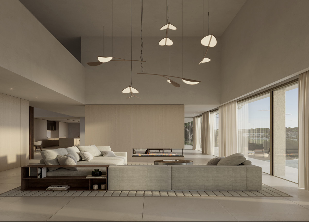 Seamless transitions between indoor and outdoor living are a defining feature of Villa Falco. Expansive terraces—both covered and uncovered—provide multiple spaces for relaxation, dining, and entertaining. The infinity swimming pool blends effortlessly with the lush surroundings, while a sunken lounge creates a unique spot for socialising. Upstairs terraces offer more private vantage points to enjoy views of the landscape and coastline.