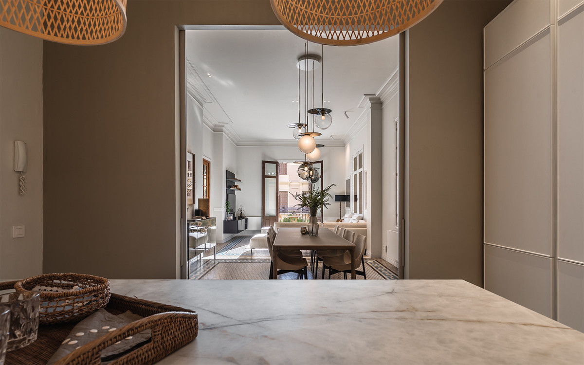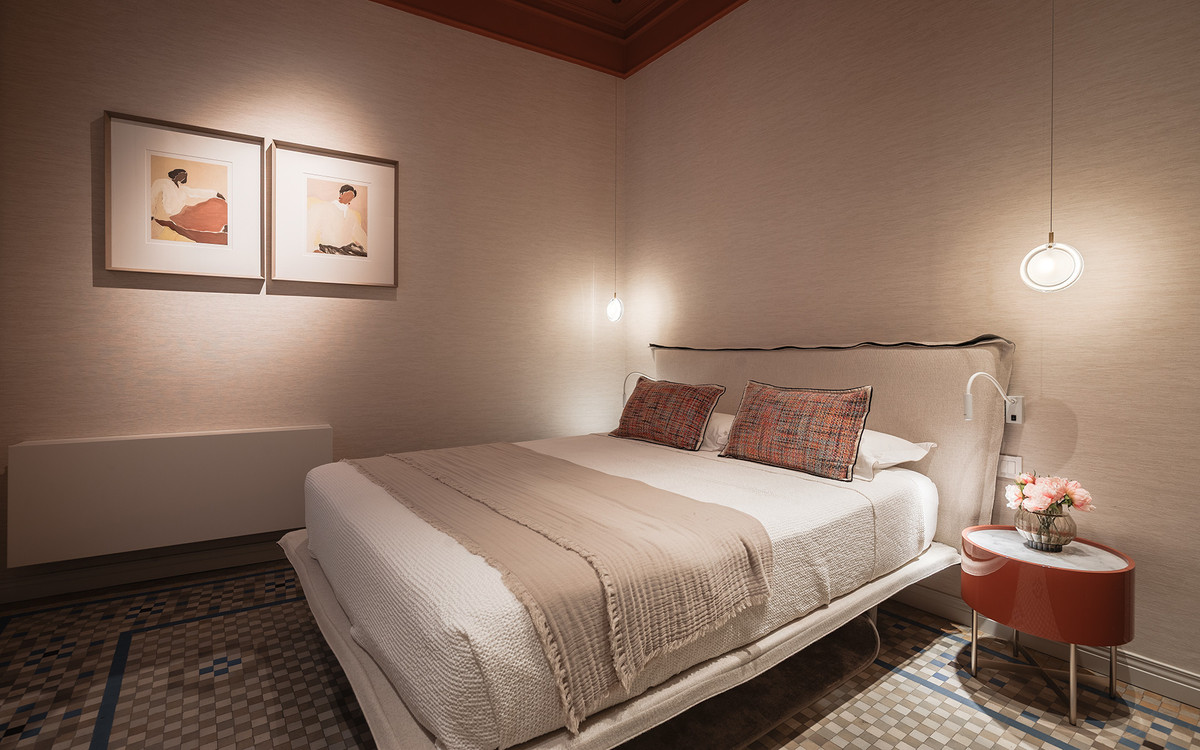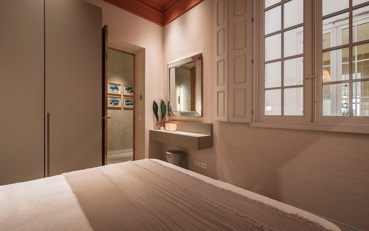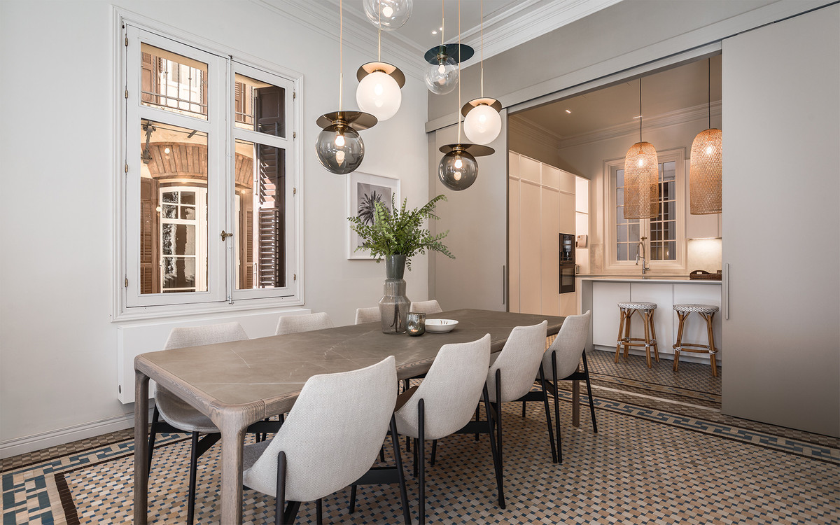The materials and finishes reflect a careful combination of tradition and contemporary comfort. The walls feature artisanal lime stucco, microcement, and eco-friendly paint by Farrow & Ball. The original Nolla mosaic flooring, meticulously restored, is preserved throughout most of the property, adding character and aesthetic coherence. The doors and windows from 1922 have been recovered, maintaining the original woodwork and updating hardware and mechanisms to ensure functionality.