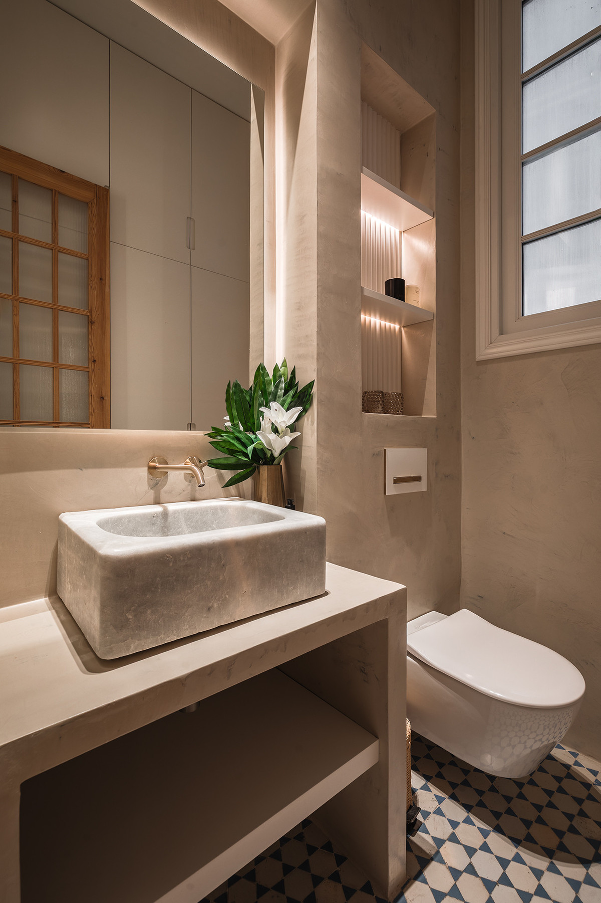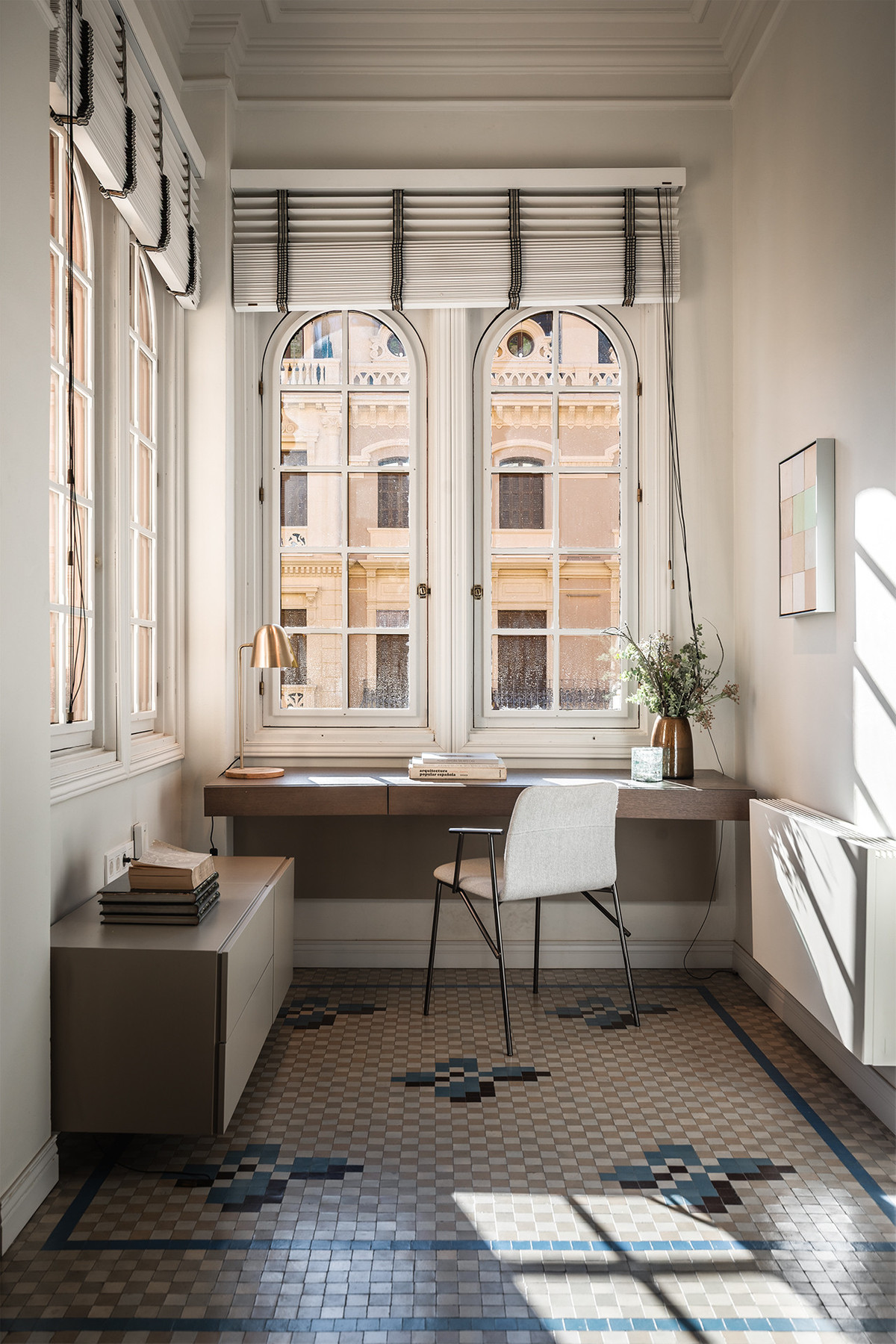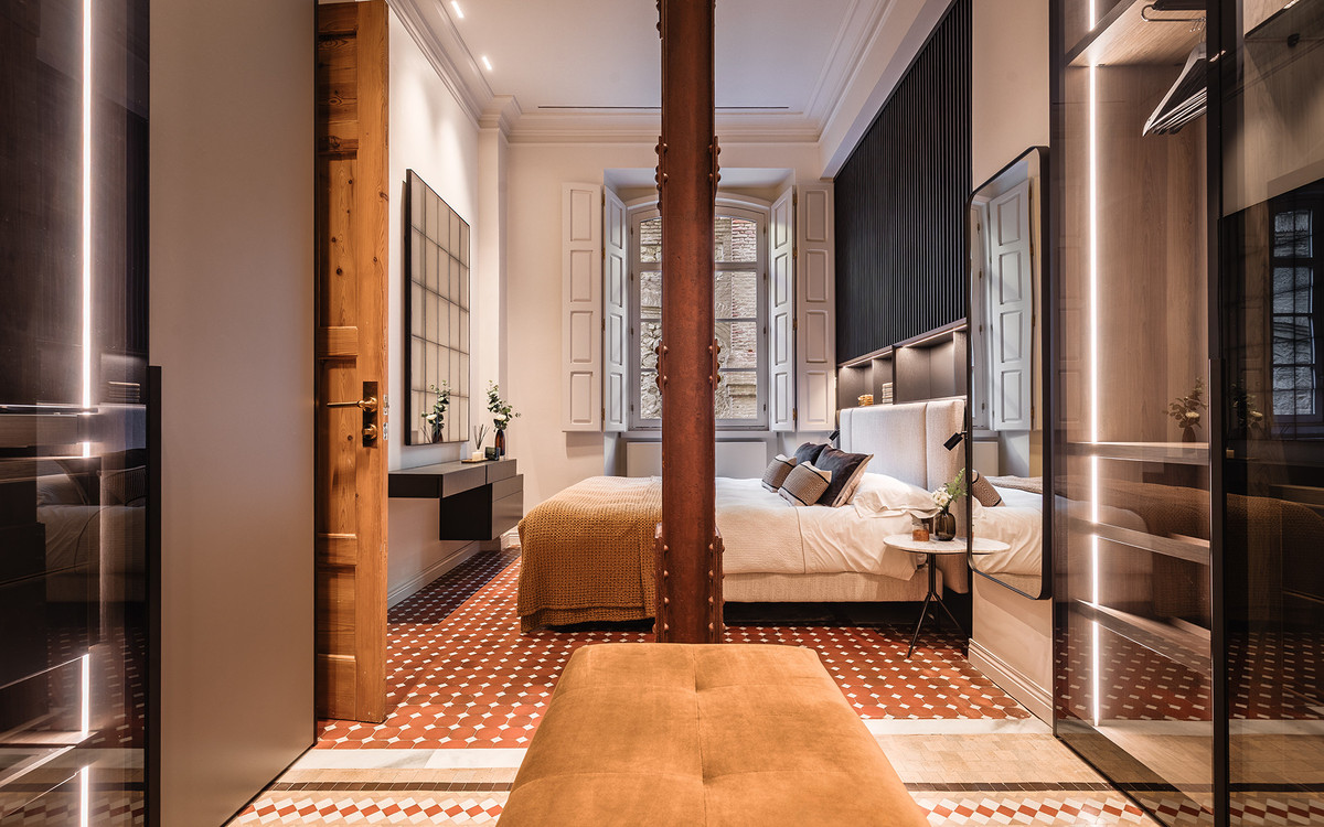The materials and finishes reflect a careful combination of tradition and contemporary comfort. The walls feature artisanal lime stucco, microcement, and eco-friendly paint by Farrow & Ball. The original Nolla mosaic flooring, meticulously restored, is preserved throughout most of the property, adding character and aesthetic coherence. The doors and windows from 1922 have been recovered, maintaining the original woodwork and updating hardware and mechanisms to ensure functionality.