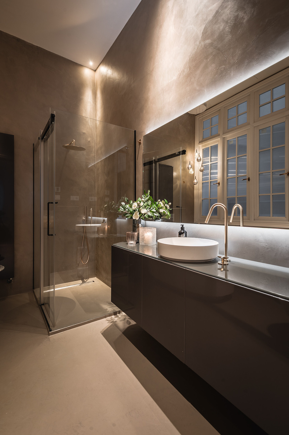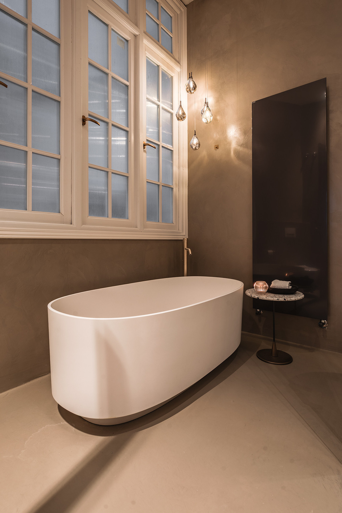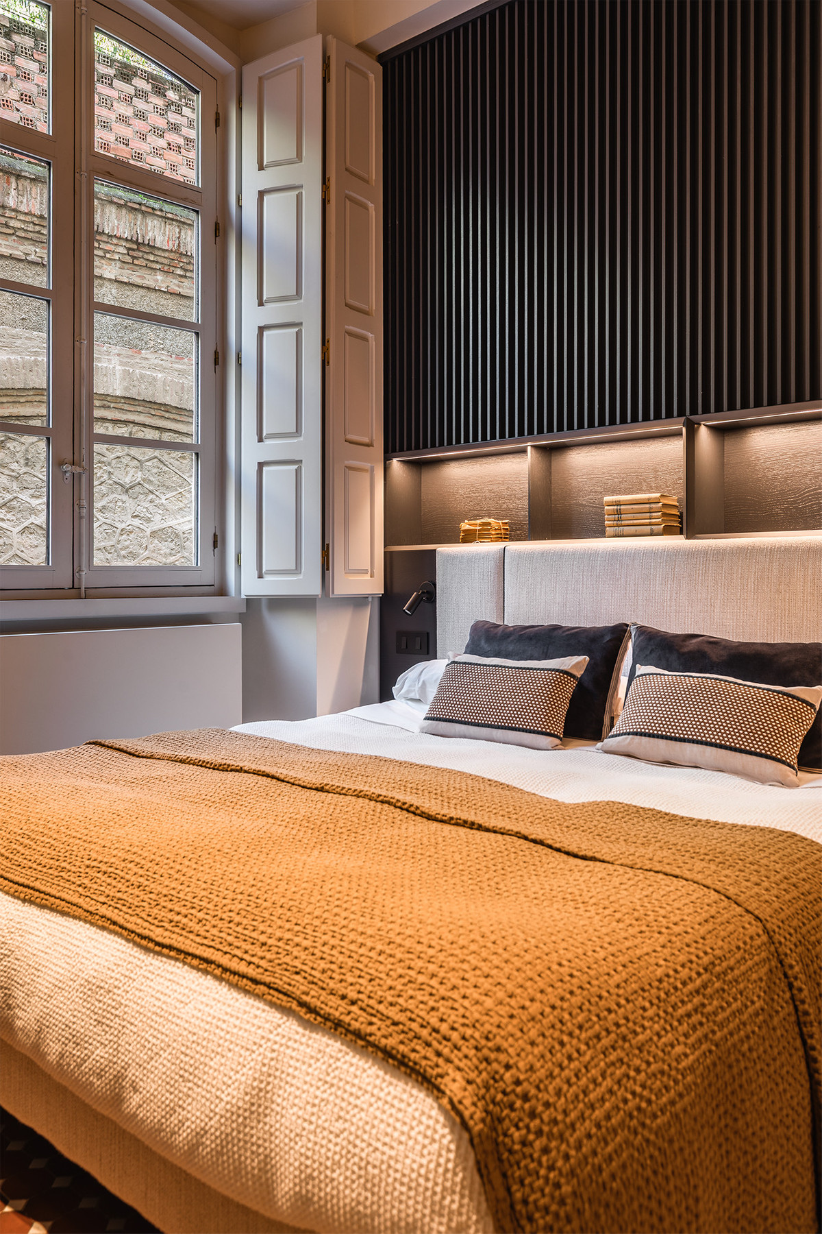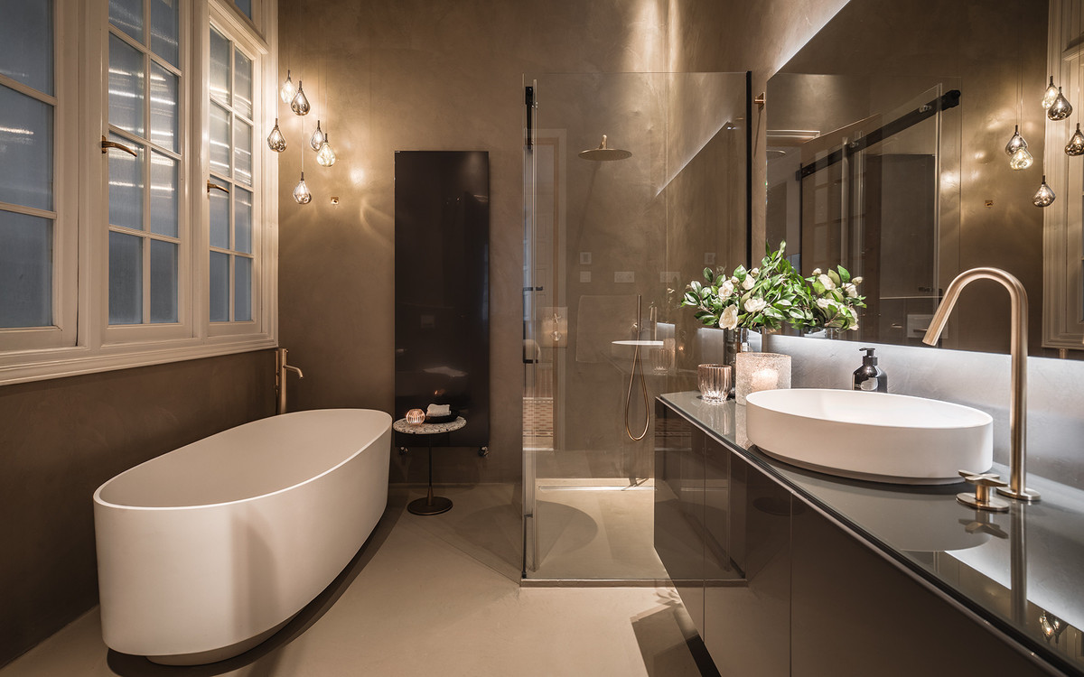 The bathrooms include pieces by Villeroy & Boch and brushed gold fittings by Toro Bath, alongside sober-lined furniture by Inbani. The lighting, designed by Eflux, discreetly enhances the architecture, while furniture by Pianca, fabrics by Casamance, and hand-blown glass fixtures by Bomma complete a setting that combines history, design, and comfort with balance and naturalness.