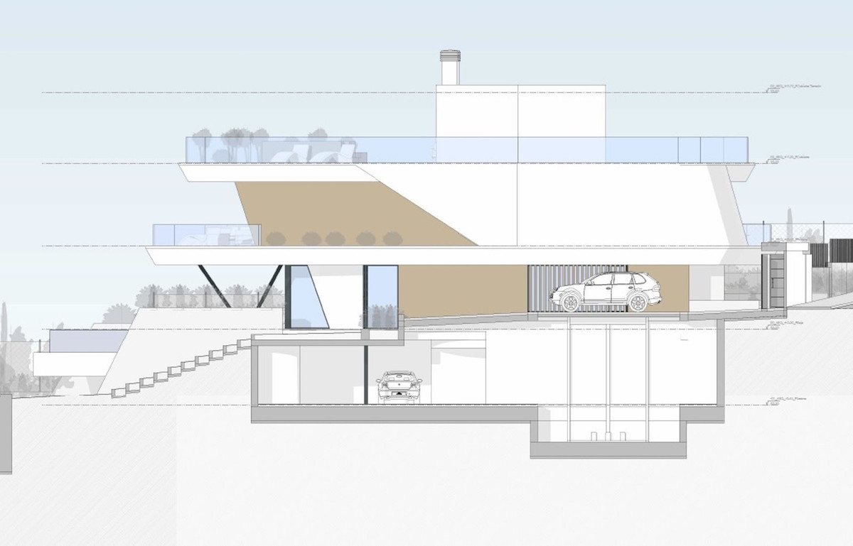 The project is a modern Mediterranean-style detached villa, distributed over four levels adapted to the slope of the terrain. It includes a basement garage, an open-plan living room and kitchen on the ground floor, three bedrooms on the first floor, and a rooftop solarium with a jacuzzi. It fully complies with the PGOU Mijas urban planning regulations, including maximum buildability (0.50 m²/m²), height, occupancy, and 3.00 m minimum setback.