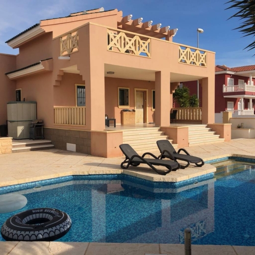 Contemporary detached villa built in 20204 bedrooms & 3 modern bathrooms153 m² build size on a 533 m² private plotPrivate saltwater swimming pool - L-shaped, approximately 7 x 4 meters Off-road parkingOpen-plan kitchen with quality appliancesSouth orientation for all-day sunSolarium with panoramic viewsLaundry/utility room & storage roomAir conditioning - hot and coldUnderfloor heating in bathroomsSolar panelsEnergy rating: BWalking distance to shops, cafés & services (300 m)