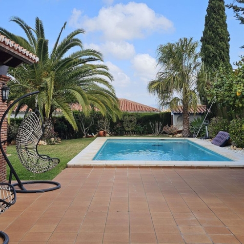 Spectacular property for sale on a 4000m2 fenced urban plot. The house has over 400m2 of living space distributed on the ground floor with 4 living rooms, a fitted kitchen with pantry, two bathrooms and a dining room. On the first floor, there are 6 bedrooms with wardrobes, two bathrooms with showers, all with air conditioning. Outside, there is a beautiful garden with many fruit trees, a vegetable garden, a huge porch of over 60m2, a swimming pool, several storage rooms, an Andalusian-style patio, a private well and mains water, an automatic gate, and an asphalt road leading to the property. With all amenities nearby, it is perfect for a large family or holiday rentals. It is located in a very quiet area, just a few meters from the town center on foot. It is located just 10 minutes from the International Airport of Malaga, 10 minutes from beaches, 20 minutes Malaga city, 10 minutes from the golf courses.