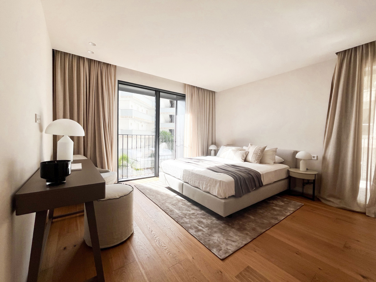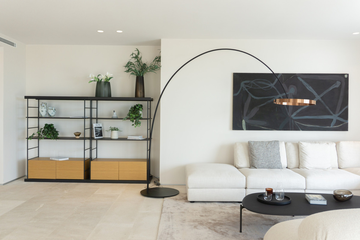 Inside, the apartment unfolds across two floors with a layout designed for fluid living. Three bedrooms provide ample space for rest and privacy, each equipped with en-suite bathrooms and custom wardrobes. The aesthetic leans toward warm minimalism—oak-engineered flooring, exposed concrete ceilings, and a refined palette of natural textures give the space its calm, contemporary character. Full-height windows open the interiors to the scenery beyond, blurring the lines between inside and out.